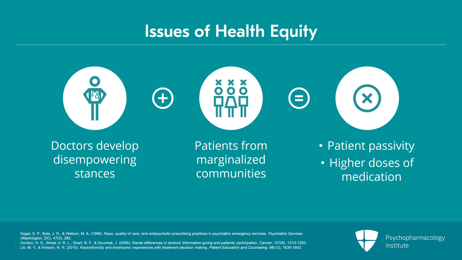 A number of studies have shown there is an increased likelihood that we're going to develop disempowering stances with patients from marginalized communities. We know, for example, statistically they're more likely to prefer counseling, but then we give them, as a whole, less information about treatment options and communicate with them in a way that perpetuates patient passivity. And we're more likely to prescribe oppressively in a way that, for example, those patients are much more likely to end up on higher doses of antipsychotics than patients from dominant social groups.