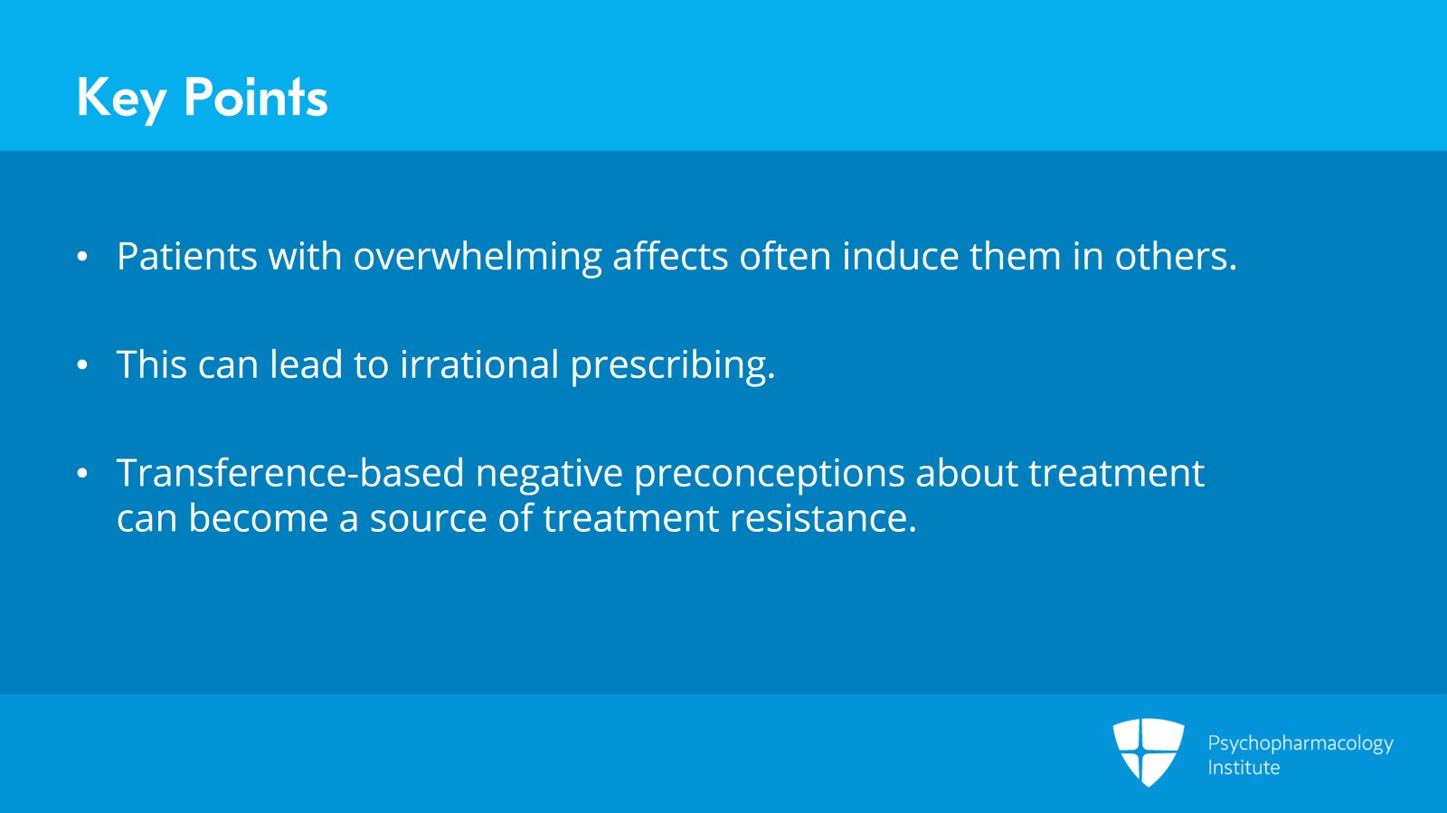 In summary: Patients with overwhelming affects very often induce corresponding affects in others. We can then prescribe in efforts not to address the patient's anxiety but to address our own, and this can lead to irrational prescribing. When patients bring transference-based negative preconceptions into care about treatment, it is typically important to identify this and address it before, or if you can, or when it becomes a source of treatment resistance.