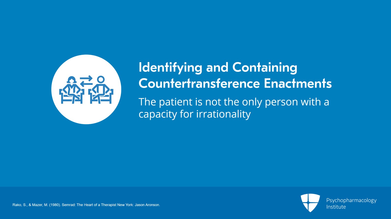 Another principle of psychodynamic psychopharmacology is identifying and containing countertransference, acting out. Elvin Semrad, who was a legendary psychotherapy teacher in Boston and the teacher of my teachers, described the doctor-patient encounter as an encounter between a big mess and an even bigger mess. And I think it's important for us to recognize that the patient is not the only person with a capacity for irrationality in the doctor-patient relationship, and that the patient is not the only person in that room that has an unconscious.
