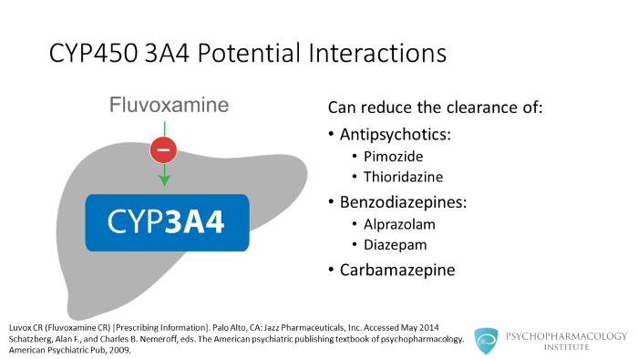 What happens when fluvoxamine inhibits CYP 3A4? This isoenzyme is involved in the clearance of some antipsychotics, benzodiazepines and carbamazepine. So, fluvoxamine can reduce the clearance of the antipsychotics pimozide and thioridazine, the benzodiazepines alprazolam and diazepam and the anticonvulsant carbamazepine.