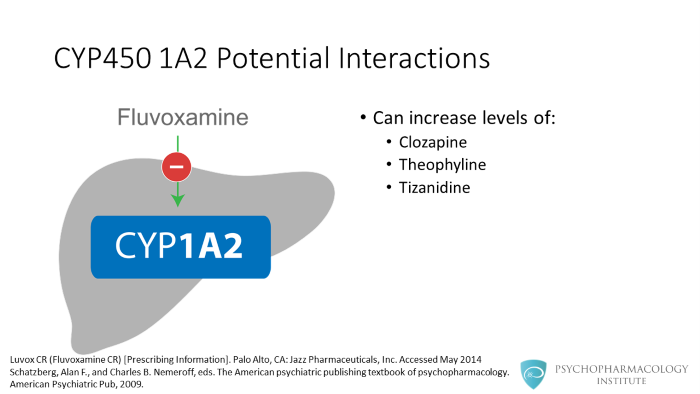 Fluvoxamine inhibits four CYP 450 isoenzymes, we are going to focus on two of them: CYP 1A2 and CYP 3A4. . In vitro data shows that fluvoxamine inhibits two other isoenzymes, these are CYP 2C9 and C219.