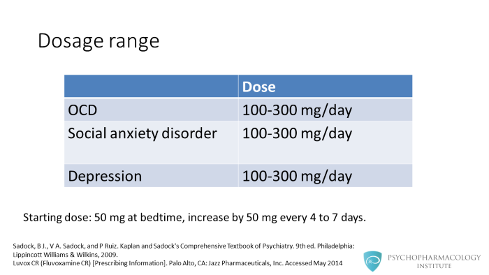 Fluvoxamine is FDA-approved for OCD and social anxiety disorder. For these two indications the therapeutic range is between 100 to 300 mg/day. Fluvoxamine is commonly used in other countries for depression in the same range, but response is commonly seen in the 100 to 200 mg/day range. The starting dose is 50 mg administered at bedtime. This dose may be increased by 50 mg every 4 to 7 days.