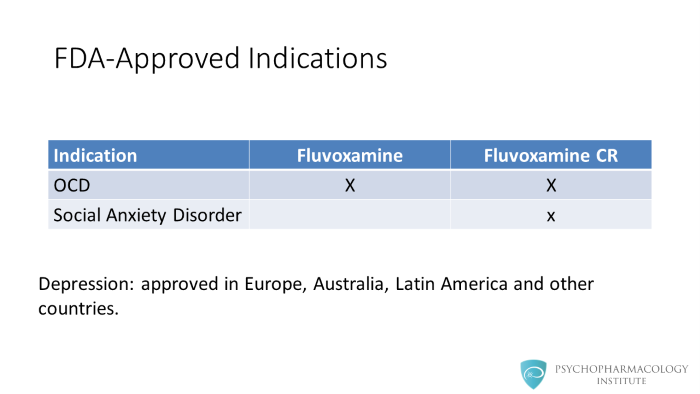 Fluvoxamine is approved as immediate release and controlled release formulations The immediate release formulation is approved for OCD and the controlled release for OCD and social anxiety disorder. In the US, fluvoxamine is not approved for the treatment of depression. However, it is approved for this use in Europe, Australia, Latin America and other countries.