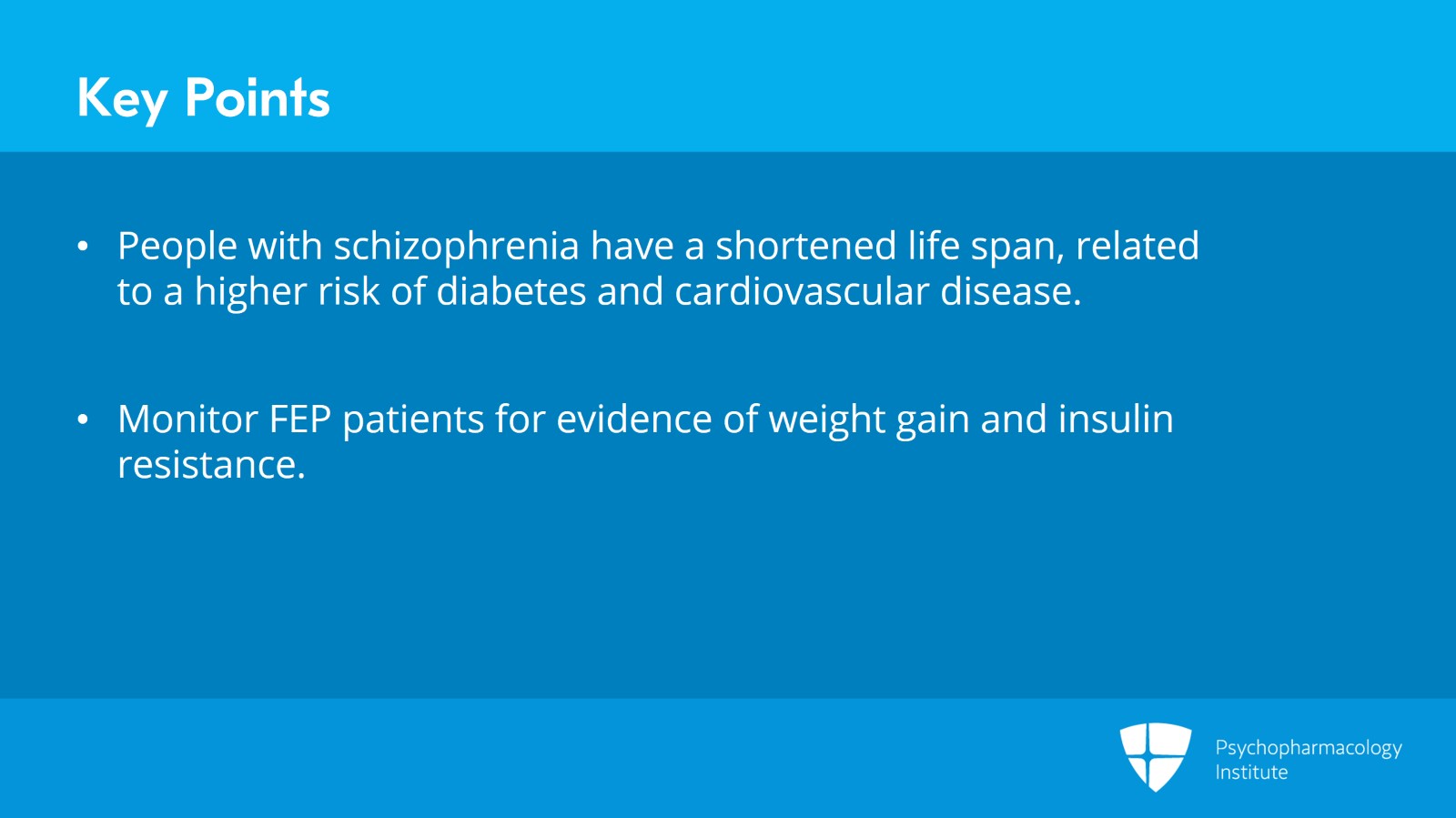 So what I’ve tried to show you during this talk is that people with schizophrenia have a shortened life span and that this seems to be related to both having a high risk of type 2 diabetes which in turn is related to a high risk of cardiovascular disease. When we have first episode patients we should carefully monitor them for evidence of weight gain and insulin resistance. And I’m going to talk in a subsequent lecture about effective medications and lifestyle interventions that should be considered when patients have these problems. Thank you very much.