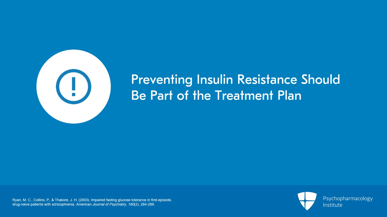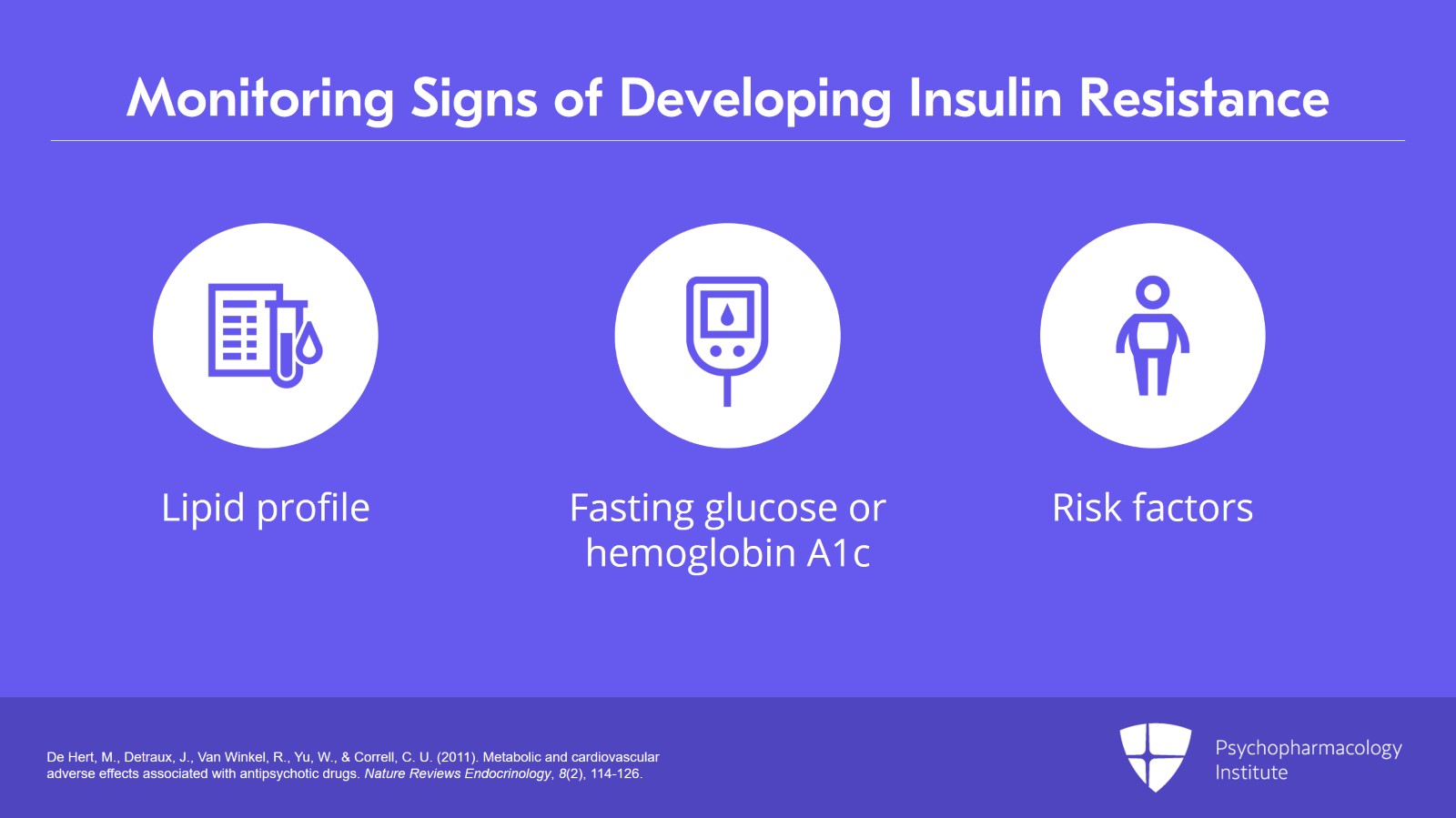 Clinicians during the early stages of treatment, and this is not just at the first episode, for any patient should be monitoring for signs of developing insulin resistance. It could be looking at lipid profiles and focusing on triglycerides, looking at fasting glucose or hemoglobin A1c and of course looking at whether the patients have risk factors to start with.
