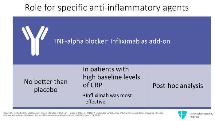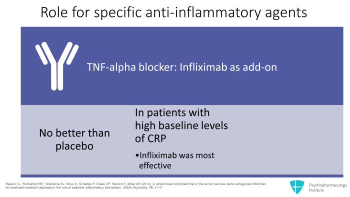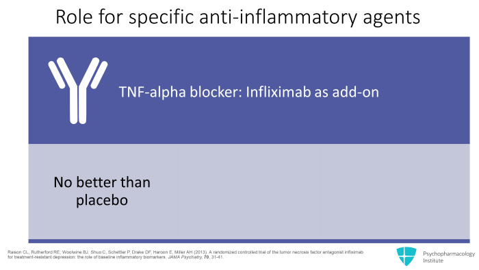 There is one trial with a TNF-alpha blocker, infliximab, which was added to the medication of treatment with resistant depression. In general, this didn’t seem to do better than placebo in the overall group of patients.