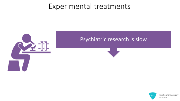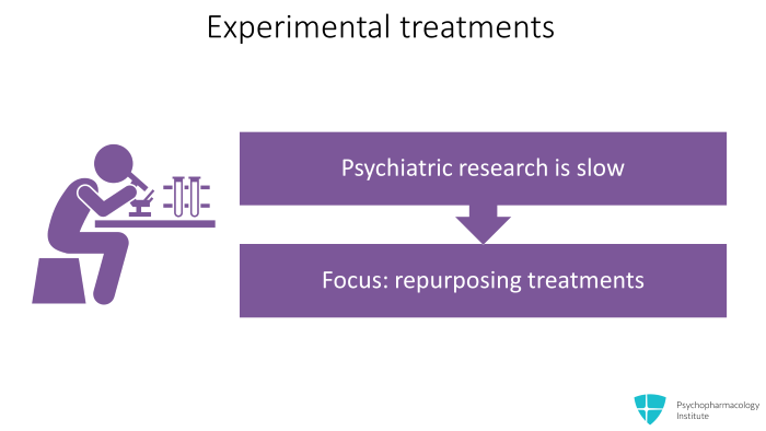 I wanted to say something about experimental pharmacological treatments. One aspect of psychiatric research that’s slow for the moment is that there aren’t many new drugs coming through the usual discovery pathways. That’s via industry.