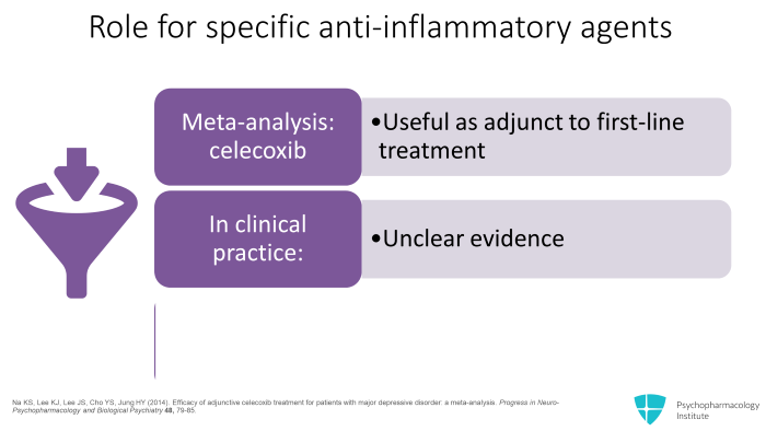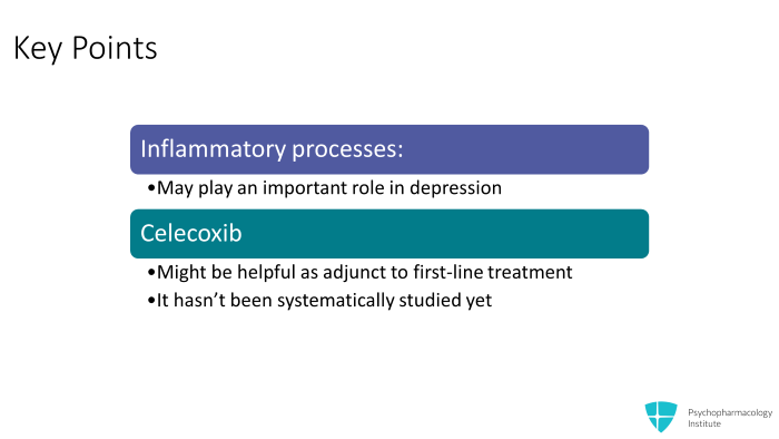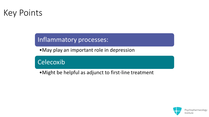 And a meta-analysis suggests that the COX-2 drug, celecoxib might be helpful as an adjunct to first-line treatment in serotonergic and noradrenergic antidepressants