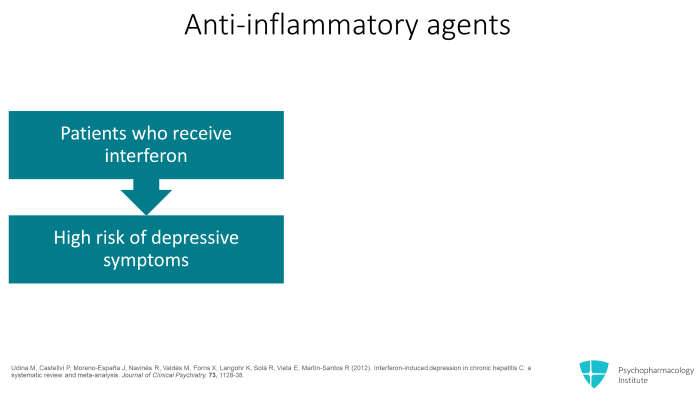 More directly, we know that when patients who aren’t depressed receive inflammatory cytokines such as interferon, they have a high risk of experiencing the symptoms of major depression subsequently.
