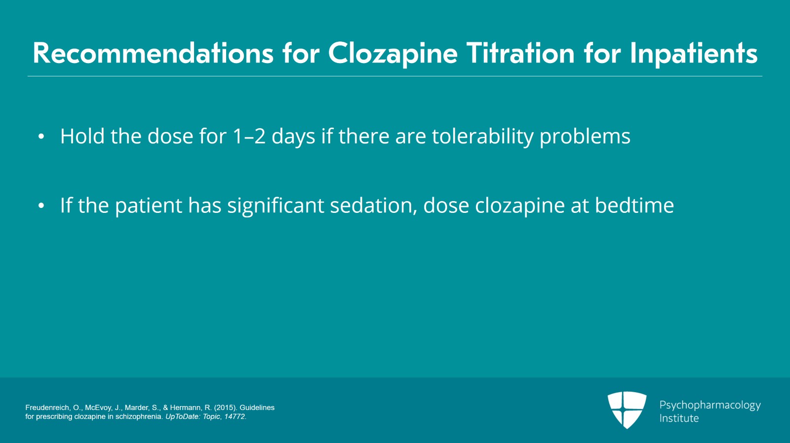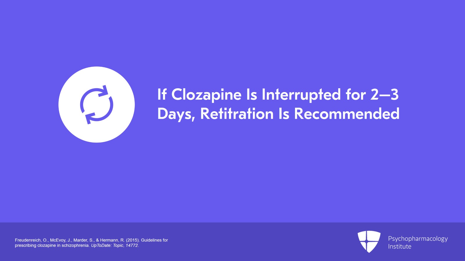 Importantly, it’s mentioned an issue that if treatment with clozapine is interrupted for two to three days, for 48 or 72 hours that retitration is recommended.