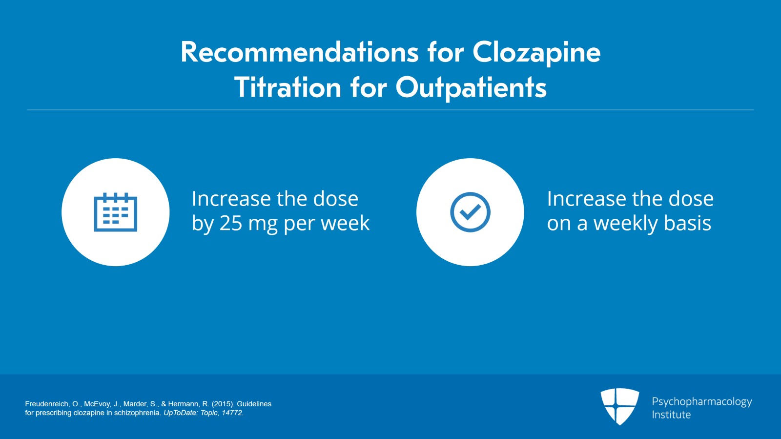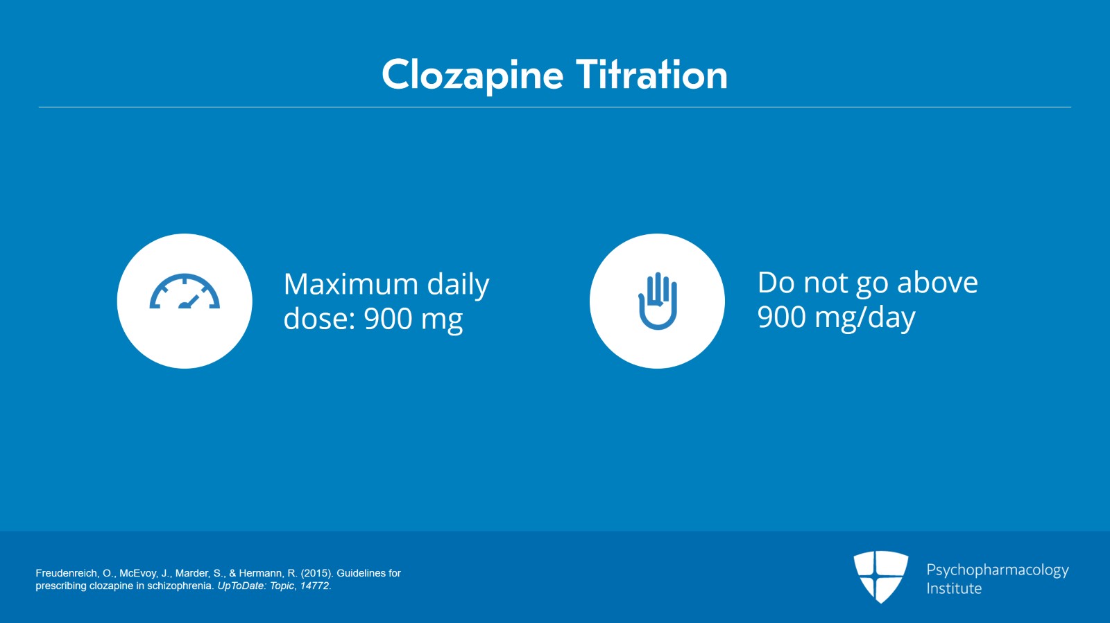 - Freudenreich, O., McEvoy, J., Marder, S., & Hermann, R. (2015). Guidelines for prescribing clozapine in schizophrenia. UpToDate: Topic, 14772.