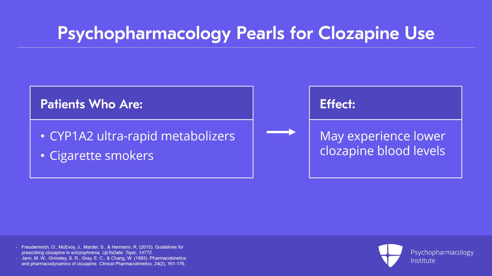 So as a result, people who are CYP1A2 ultra-rapid metabolizers or patients who are cigarette smokers which upregulate the activity of 1A2, those patients may experience lower clozapine blood levels even at higher doses.