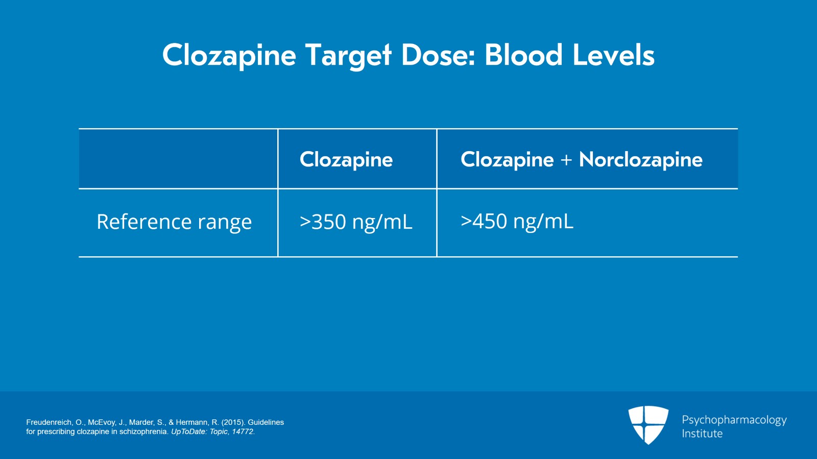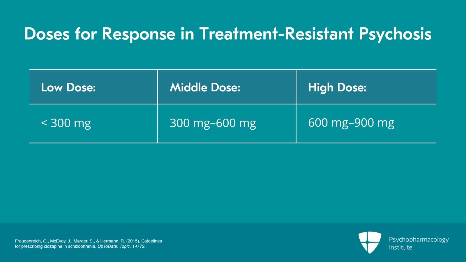 So what we see is that in patients with treatment-resistant psychosis, I would say the average final dose is about 400 mg per day, but the typical range for response is 300 to 900 mg per day. I would say 300 to 600 is a middle of the road clozapine dose, low-dose clozapine which some patients respond to which would be doses less than 300 mg a day and then we have other patients who need higher doses of clozapine in the range of 600 to 900 mg a day for an adequate response.