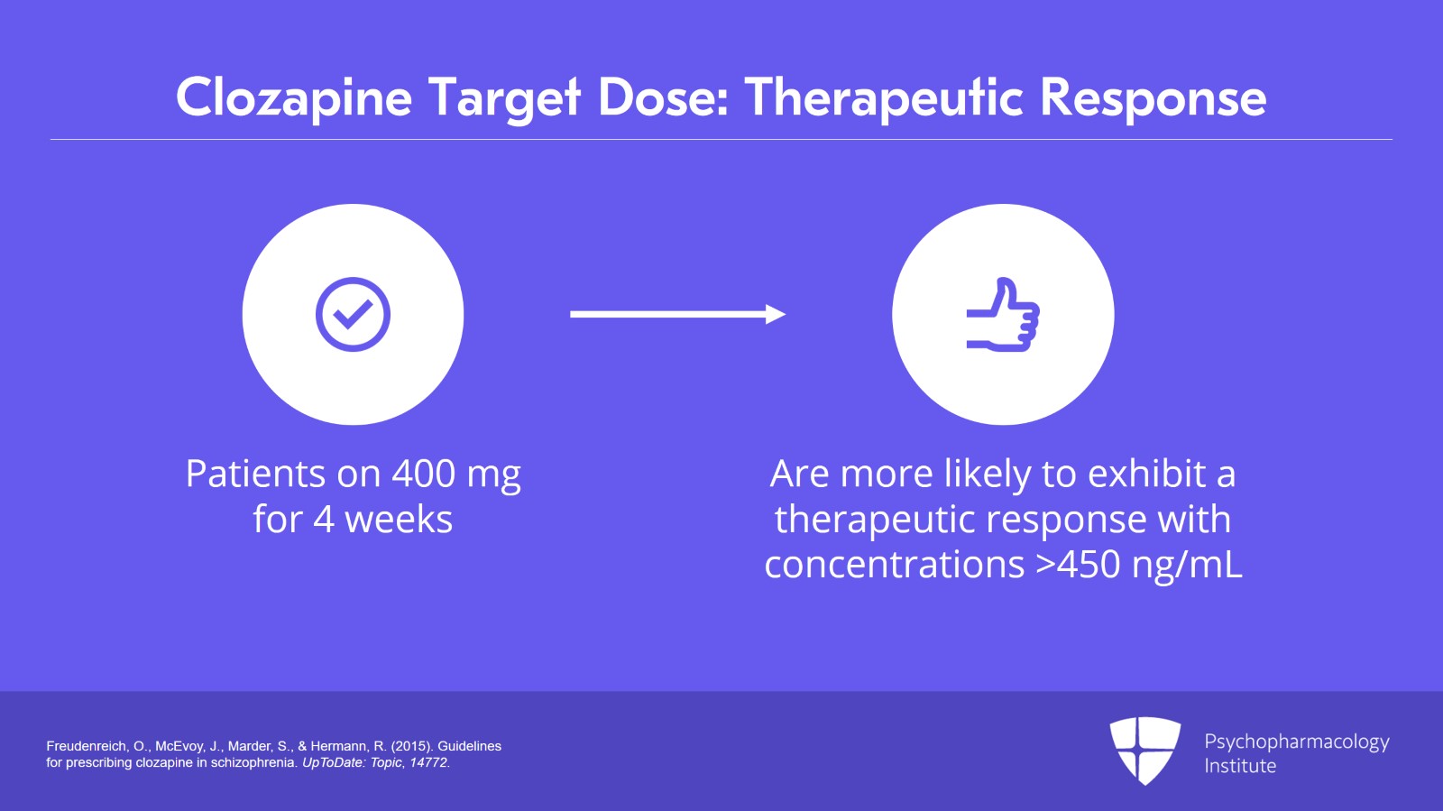 So what we see is that on patients who are on a dose of at least 400 mg per day of clozapine for four weeks, those patients were most likely to have a significant therapeutic response to clozapine when the total clozapine level plus norclozapine was greater than 450.