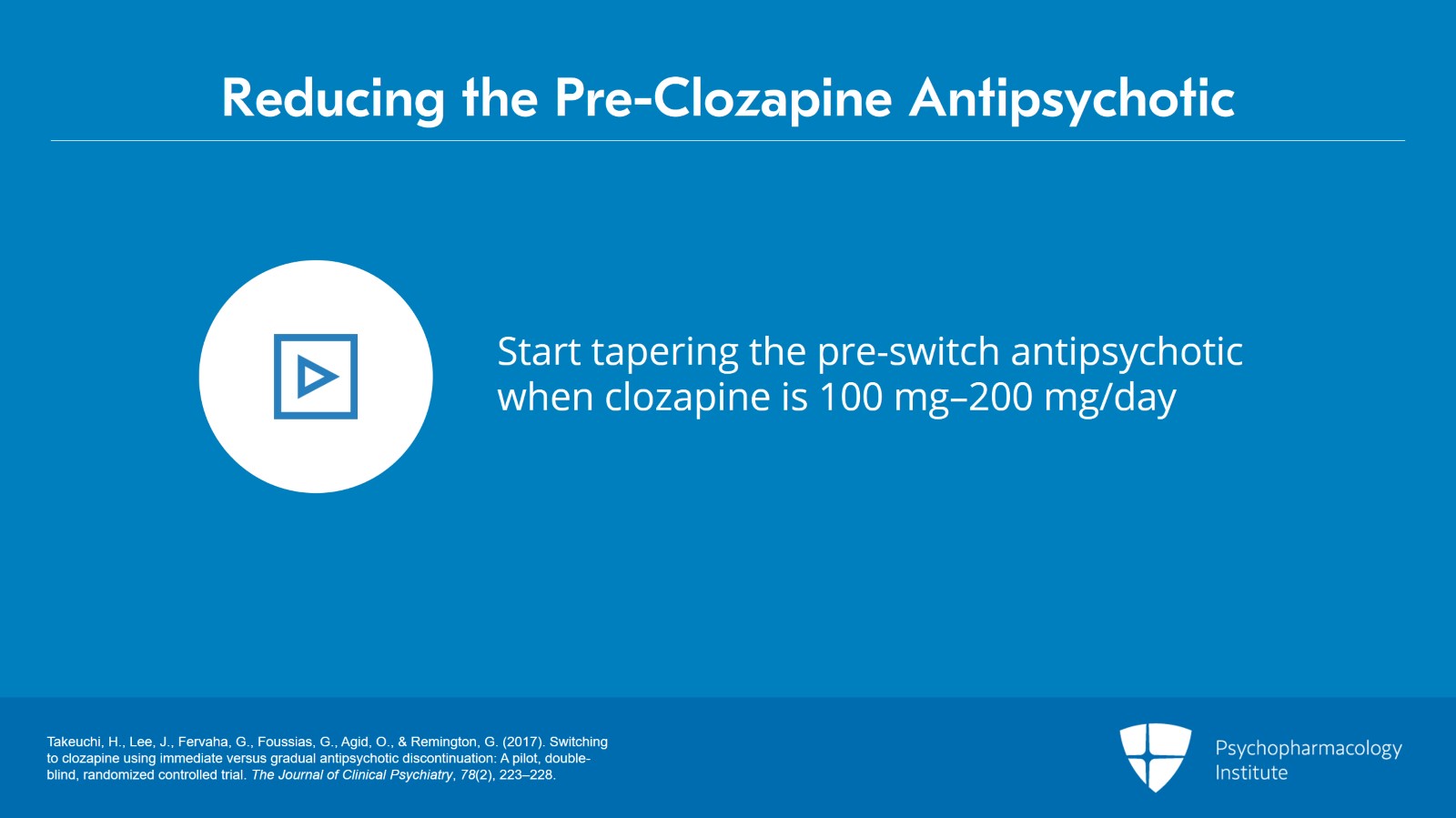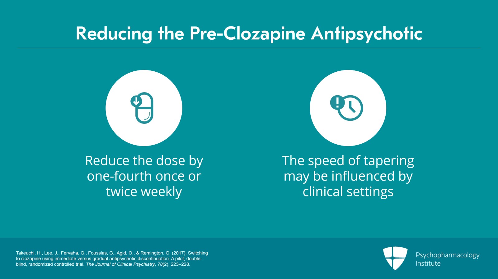 I would say one approach is to reduce the dose of the pre-clozapine antipsychotic by about one-quarter once or twice weekly, typically once a week in the outpatient setting or it could be done twice weekly as an inpatient. So again, the speed of tapering may be influenced by clinical setting.