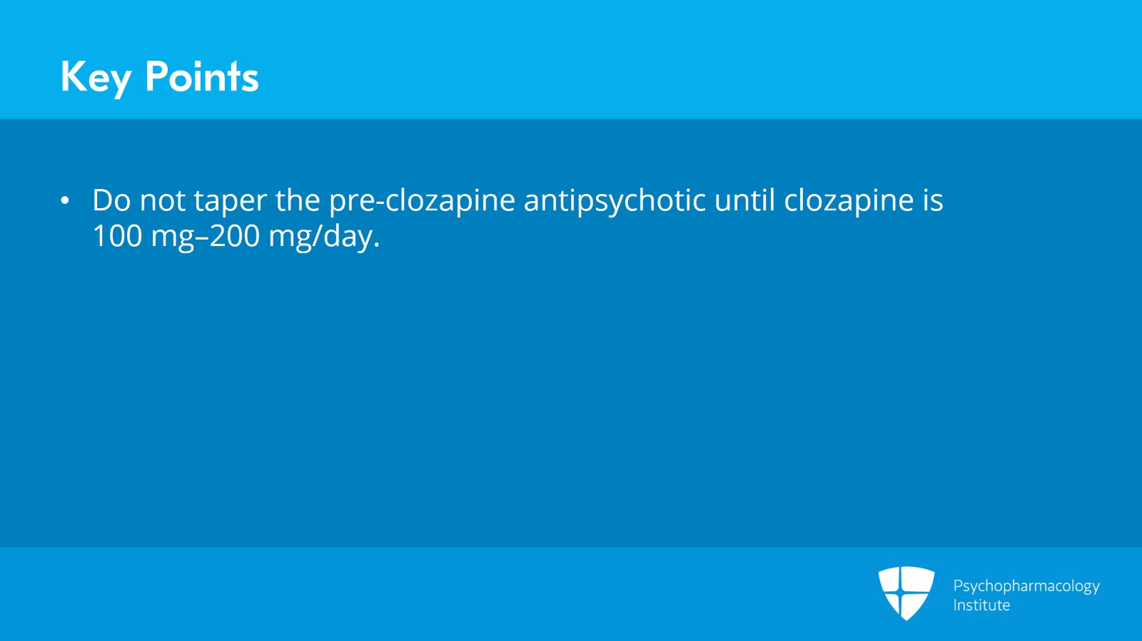 So there’s really minimal evidence in the literature to guide how we stop the pre-clozapine antipsychotic. I would contend that unless there’s some urgent need due to a serious adverse effect that it’s common to start tapering off the pre-switch antipsychotic when we get to a clozapine dose between 100 to 200 mg per day and that’s the strategy I use in my clinical practice.
