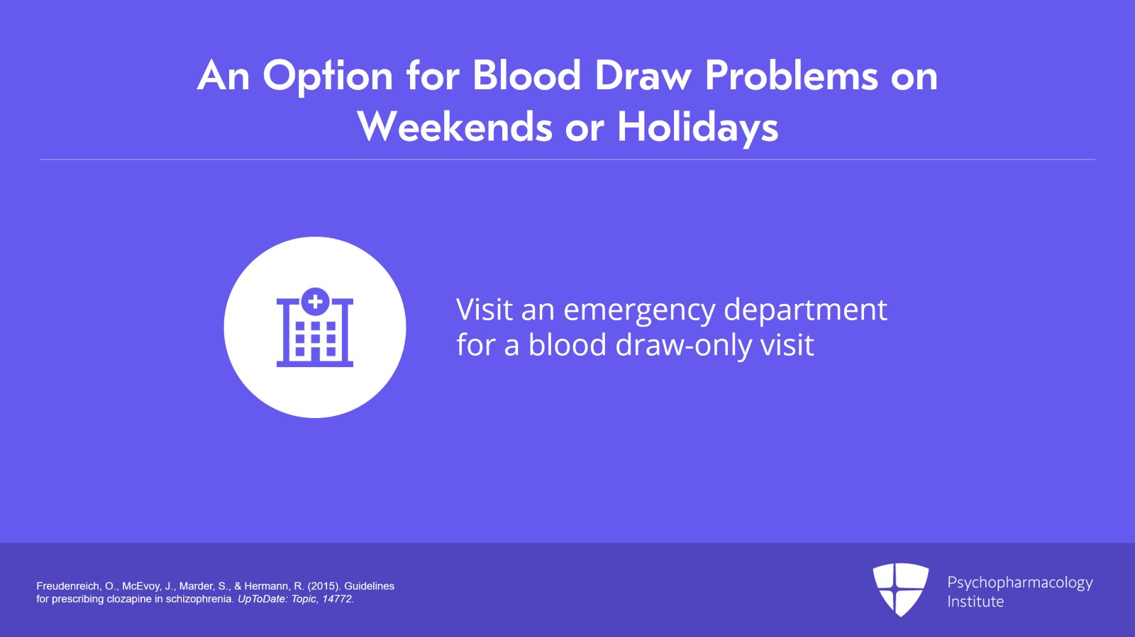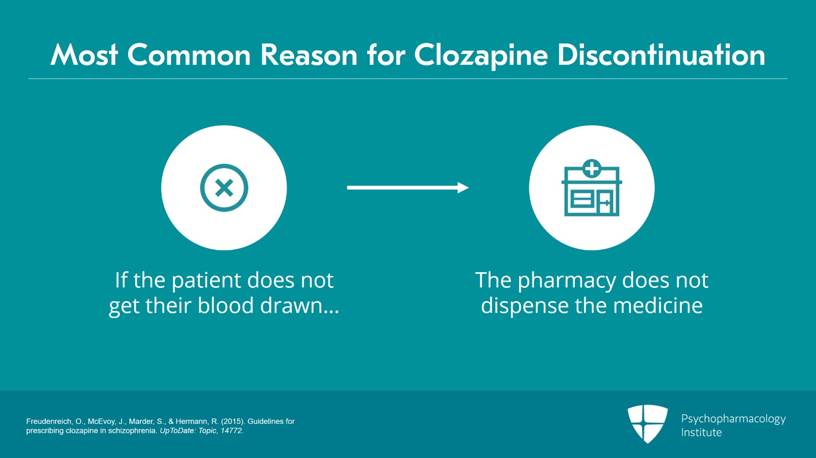 Number one, the new clozapine REMS system allows for a clinician discretion option where as the patient status form can be completed even without the blood draw in hand if, for example, it’s a patient who’s been stable long-term on clozapine and they couldn’t get labs done because their usual blood draw day fell on a holiday during the week. And so that option to put in a clinician discretion can allow the patient to get the medicine and they can go get the blood work as soon as possible thereafter.