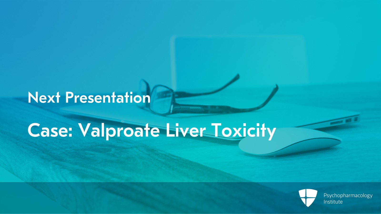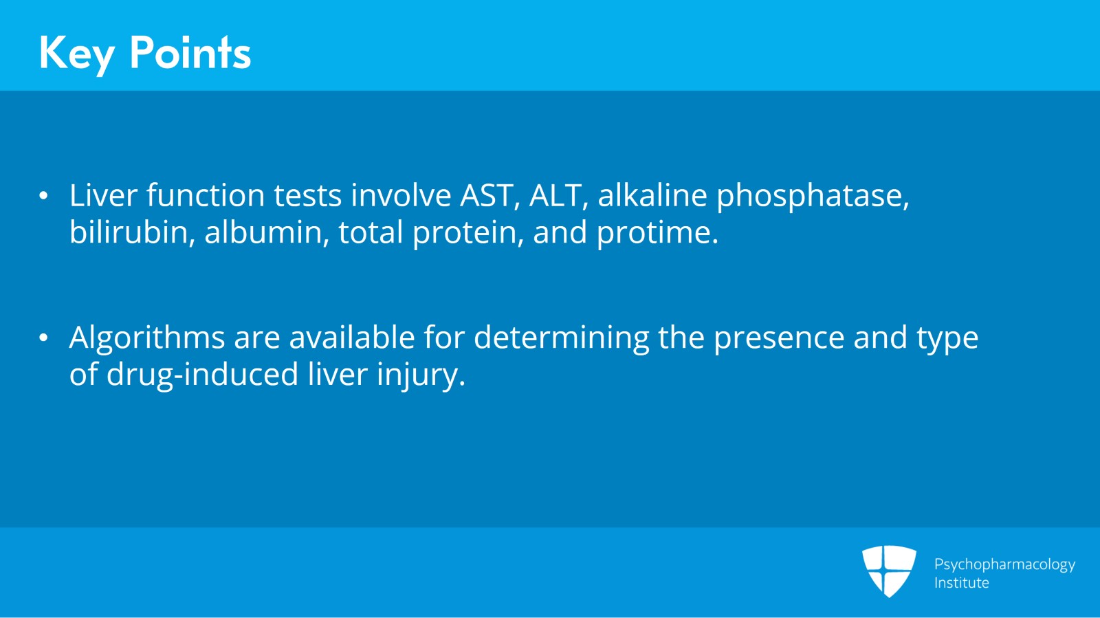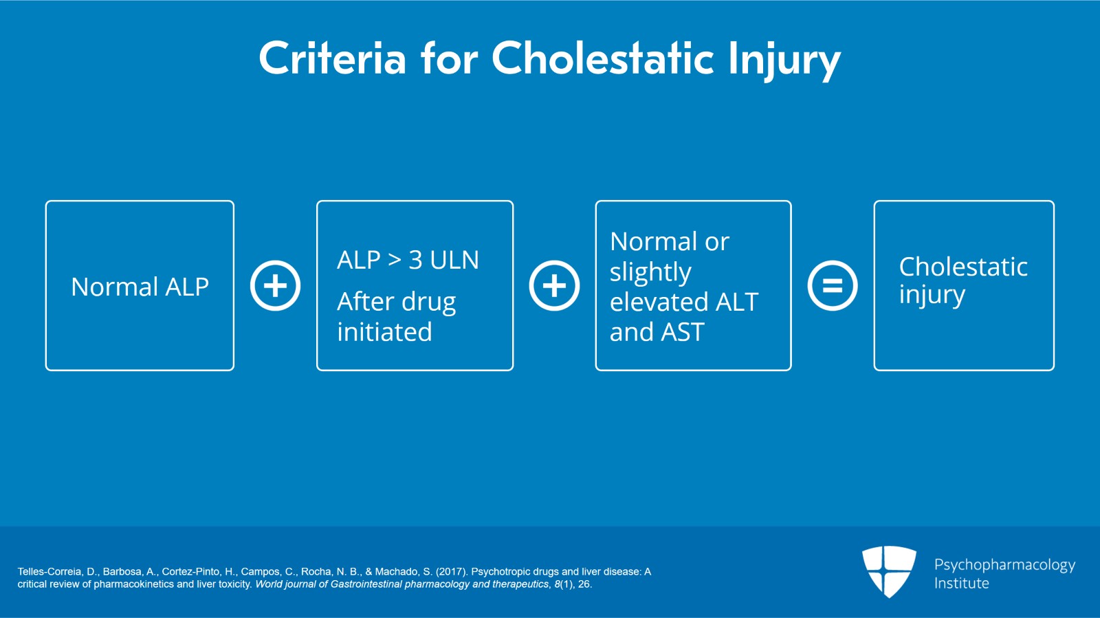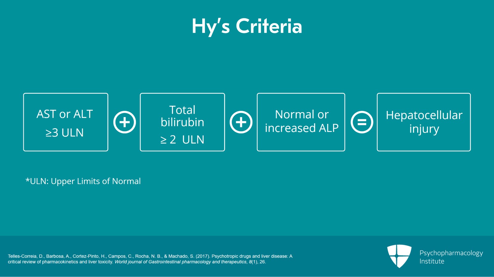 The first is a very simple rule of thumb that is used by some clinicians and that is if the ALT is greater than three times the upper limit of normal or the alkaline phosphatase is greater than two times the upper limit of normal, the drug should be stopped and/or consultation obtained. By consultation, I mean, with a gastrointestinal consultant. It’s worth noting though that AST and ALT often increase to some degree early in the course of treatment with a psychotropic drug or with a dose increase. This is not necessarily an indication for drug discontinuation. So if the AST and the ALT values are less than three times baseline and alkaline phosphatase and bilirubin are normal, the liver function test can simply be checked weekly. When the values plateau, testing intervals can be lengthened. If the AST and/or the ALT rise to more than three times the baseline or more than two times the upper limit of normal, the drug should be stopped and/or consultation obtained.