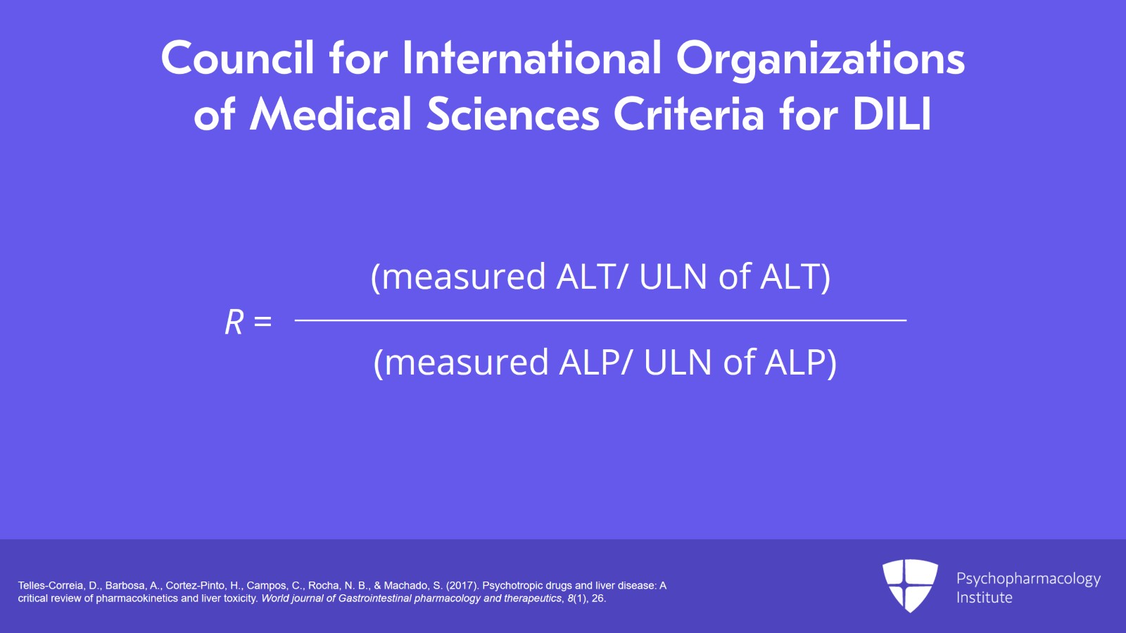 Now, more recently, the Council for International Organizations of Medical Sciences set forth criteria for determining drug-induced liver injury and its subtypes using the values of ALT and alkaline phosphatase. It involves a variable called R and R is equal to – It’s a ratio actually. It’s equal to the measured ALT divided by the upper limit of normal of ALT divided by measured alkaline phosphatase divided by the upper limit of normal of alkaline phosphatase. So that’s how you calculate R.