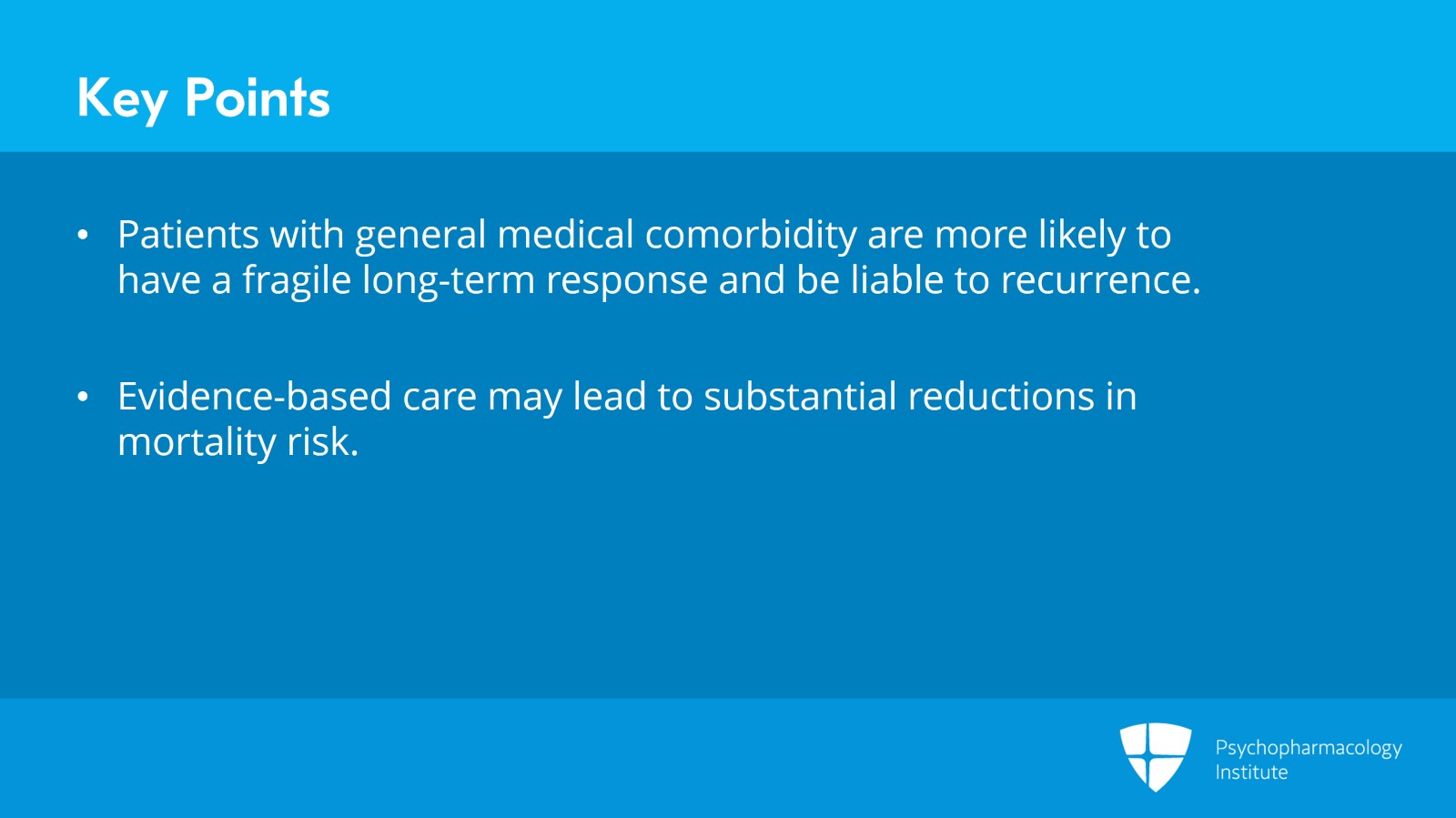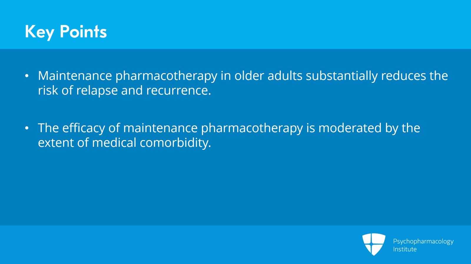 So to summarize the key points here, remember depression is frequently a relapsing recurrent illness. Maintenance pharmacotherapy in older adults substantially reduces the risk for relapse and recurrence in studies lasting as long as two and three years. Secondly, the efficacy of maintenance pharmacotherapy is influenced or moderated by the extent of medical comorbidity.