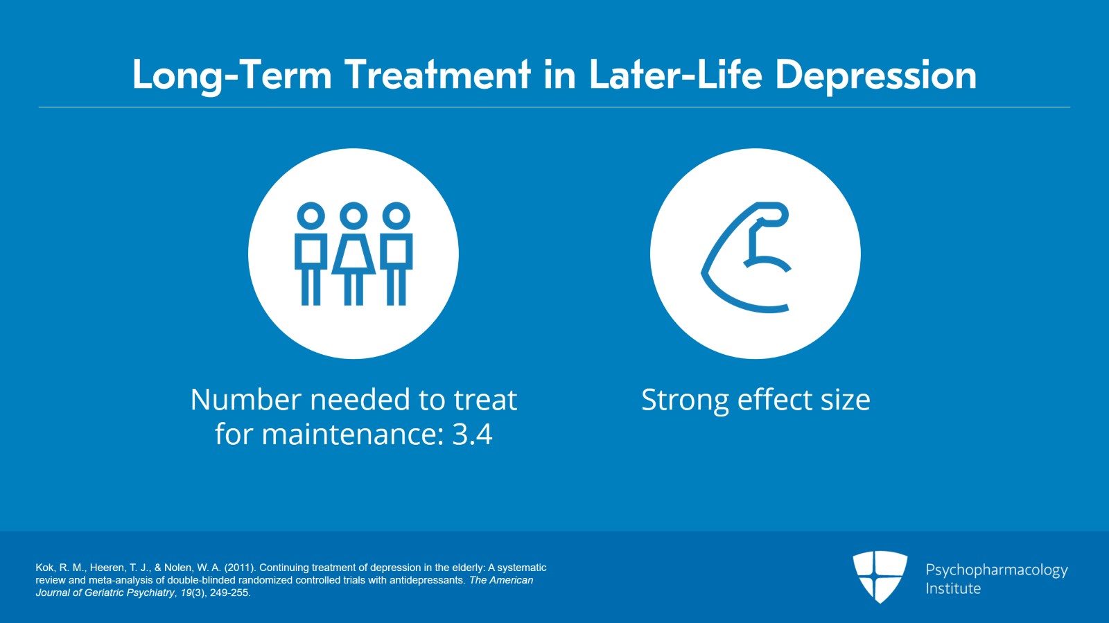 I'd like to draw, to introduce this part of our discussion on a systematic review and meta-analysis that was conducted by my colleague, Rob Kok. What we have said in essence to boil it down is that in the randomized placebo-controlled trials of maintenance pharmacotherapy in older depressed patients, the number needed to treat on average is 3.4. This is a moderately strong effect size. It means we need to treat three to four patients with maintenance pharmacotherapy to prevent recurrence for everyone that we would see with a pill placebo. Now, the number needed to treat in maintenance is considerably better than the number needed to treat as has been previously documented in earlier or acute phases of pharmacotherapy.