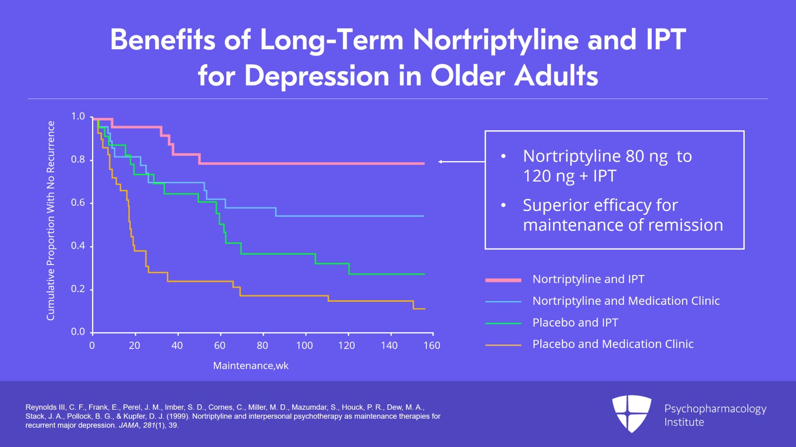 You'll see several figures here in this part of our talk and again this is from my laboratory and was the first of several maintenance trials that my group have performed over the past 20 years. The first slide shows the benefits of long-term nortriptyline and interpersonal psychotherapy for depression in older adults. These were young old patients with a mean age of 68 but with highly recurrent disease. The combination of nortriptyline at a steady state dose of 80 to 120 ng together with once monthly maintenance IPT showed a trend worthy superiority to drug alone in the maintenance of remission.