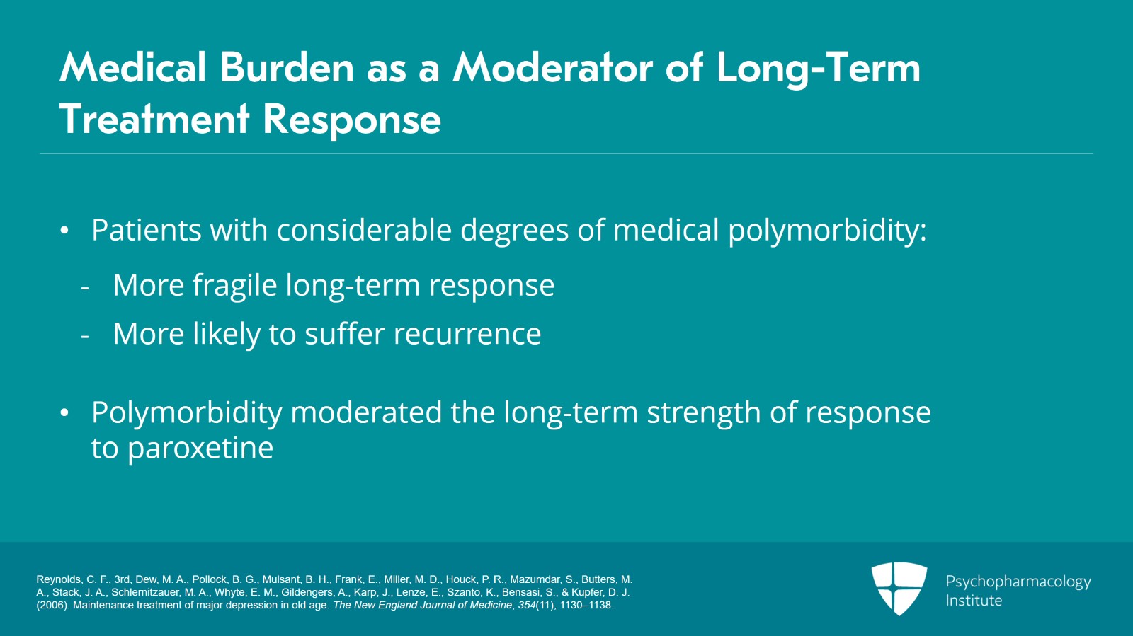 Of particular importance though and I think of great interest to colleagues who enjoy working in the interphase between Psychiatry and Primary Care Medicine, we examined the extent of concurrent medical burden, comorbidity, polymorbidity as a potential moderator of long-term treatment response. And what we found and reported in the New England Journal study was that these older patients, many of whom had considerable degrees of medical polymorbidity had a more brittle or fragile long-term response. They were more likely to suffer recurrence despite being on paroxetine. Another way of saying this is that concurrent medical burden, polymorbidity influenced or moderated the long-term strength of response to paroxetine.