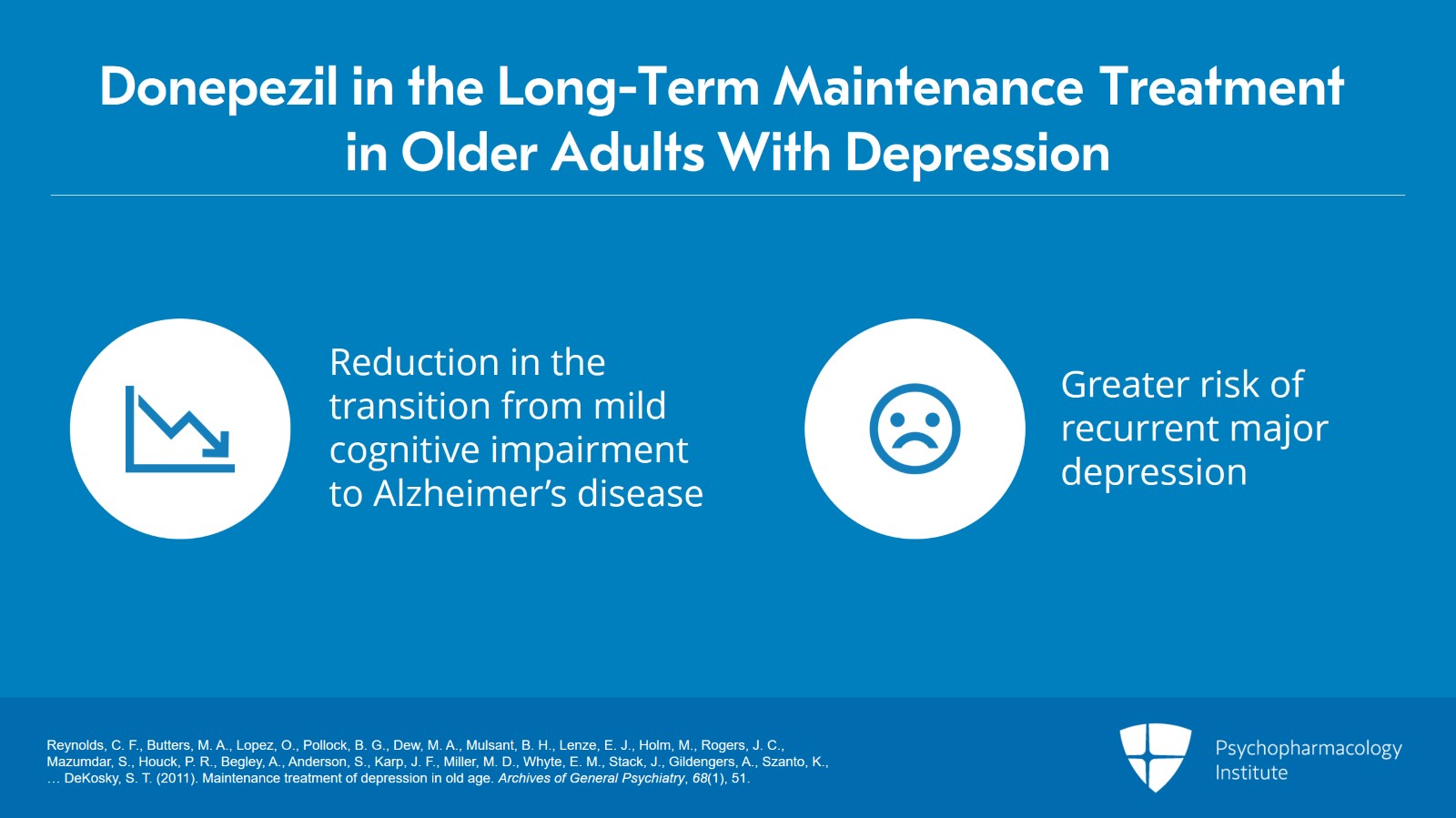 The final study that I would like to mention in this section of our time together has to do with the question of cognitive impairment in older adults with depression and whether or not there is a place for the adjunctive use of an acetylcholinesterase inhibitor, donepezil, in the long-term maintenance treatment of such patients. This was the third maintenance trial that my colleagues and I performed again with NIMH support. This particular trial was published in the Archives of General Psychiatry back in 2011. Essentially, what we did in this study was to combine maintenance pharmacotherapy, antidepressant pharmacotherapy with donepezil generally in the doses of 5 to 10 mg in a randomized placebo-controlled trial. There were several interesting observations that emerged from this. Patients randomly assigned to antidepressant pharmacotherapy with donepezil as compared to patients randomly assigned to antidepressant pharmacotherapy with pill placebo, those on combination therapy indeed showed superior performance on cognitive instrumental activities of daily living at the point of one-year follow-up. It did make a difference at one year. By two years, however, the difference in cognitive instrumental activities of daily living was no longer statistically significant.