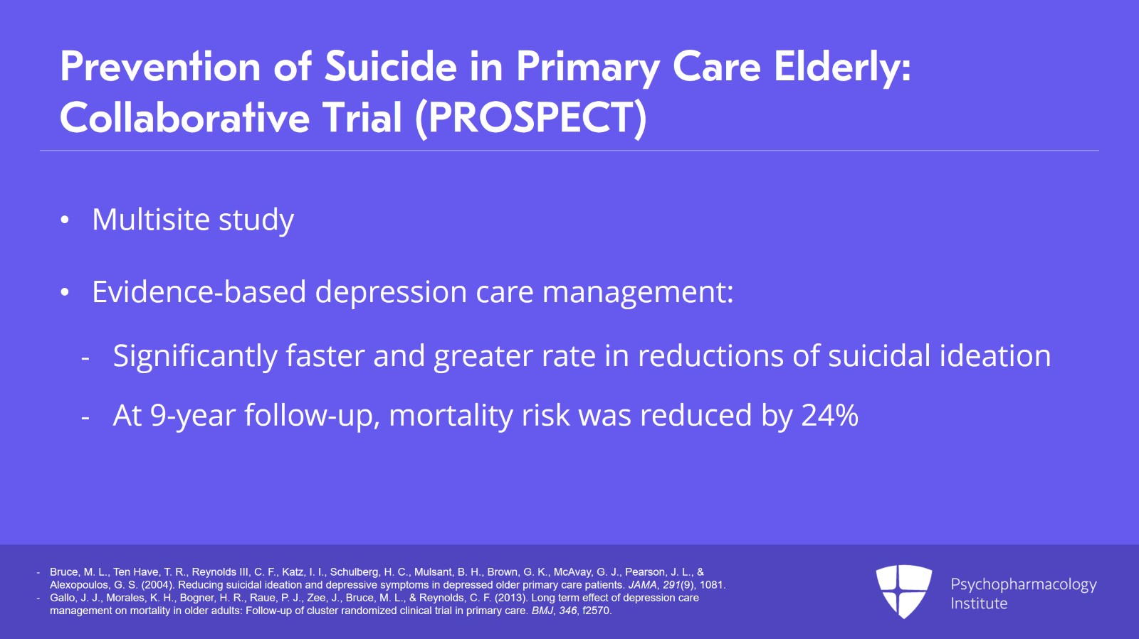 The other point that I would like to emphasize before we close out this section of our time together has to do with the effects of long-term treatment on suicide risk and mortality risk. With respect to suicide risk, I'd like to cite the PROSPECT study, Prevention of Suicide in Primary Care Elderly, A Collaborative Trial. This is a multisite study that compared evidence-based depression care management in primary care settings with care as usual. We published an observation in JAMA back in 2004 that patients who were in practices randomized to depression care management, experienced a significantly faster and greater rate in reductions of suicidal ideation as compared with usual care practices. Then with respect to the issue of mortality risk over the long term, I'd like to mention a long-term follow-up of patients who had been in the PROSPECT study and who as a result of that had received at least two years of maintenance treatment using medication and to a considerable extent counseling with interpersonal psychotherapy. At nine-year follow-up, mortality risk was reduced by 24% amongst patients who had been in practices randomly assigned to evidence-based depression care management.