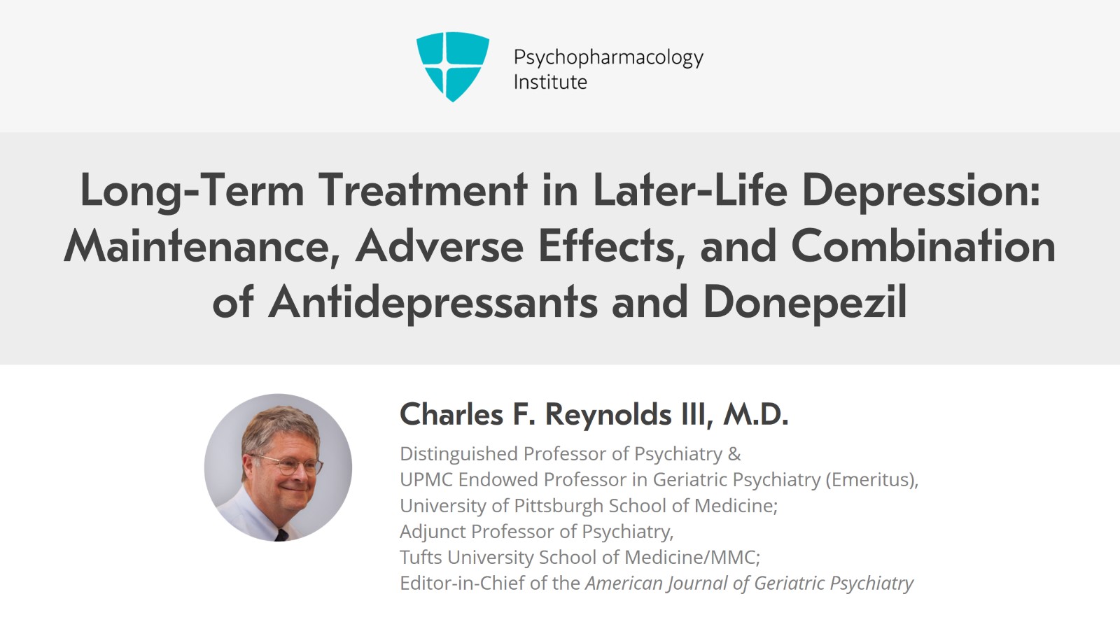 - Reynolds, C. F. (2017). Evidence-Based Treatment and Prevention of Major Depressive Episodes in Later Life. In Halter, J. B., Ouslander, J. G., Studenski, S., High, K. P., Asthana, S., Supiano, M. A., Ritchie C. (Eds.), Hazzard's geriatric medicine and gerontology (7th ed., pp. 1071–1088). essay, McGraw-Hill Education Medical.