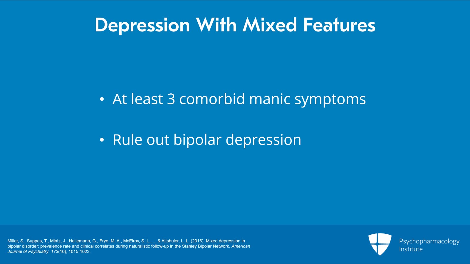 - Miller, S., Suppes, T., Mintz, J., Hellemann, G., Frye, M. A., McElroy, S. L., … & Altshuler, L. L. (2016). Mixed depression in bipolar disorder: prevalence rate and clinical correlates during naturalistic follow-up in the Stanley Bipolar Network. American Journal of Psychiatry, 173(10), 1015-1023.