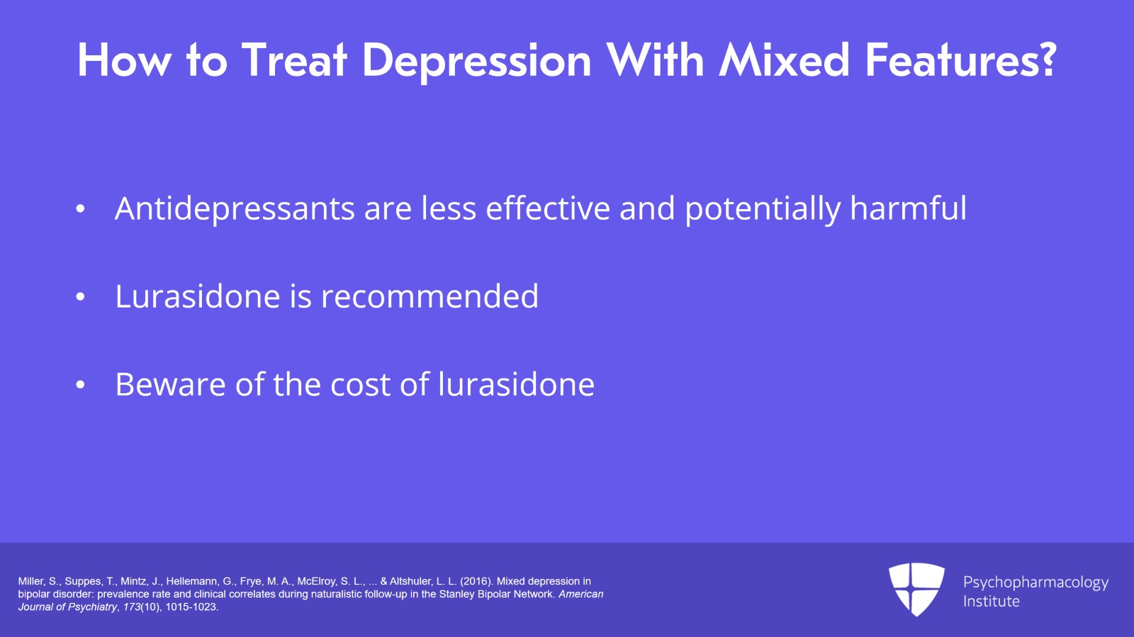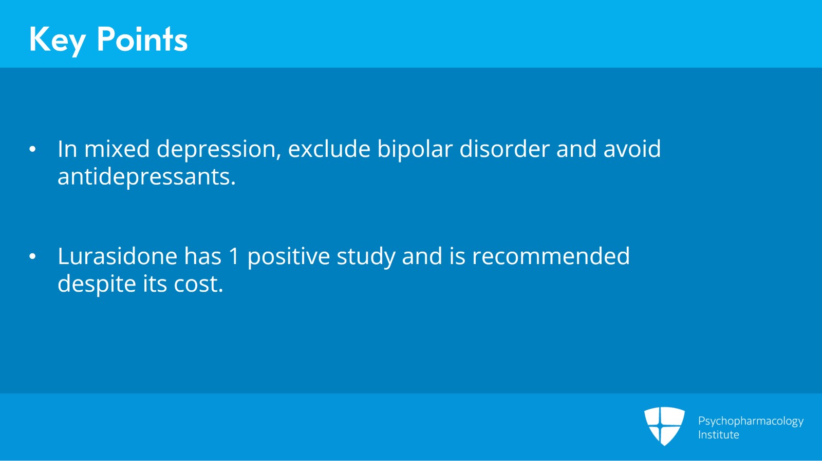 Now, lurasidone is costly compared to many other treatments for depression. And we hesitate to recommend first line an expensive agent. But given the robust effect size in this study, we are recommending it at this time and awaiting new data on whether there are any other treatments that clearly work for major depression with this new diagnosis of mixed features.