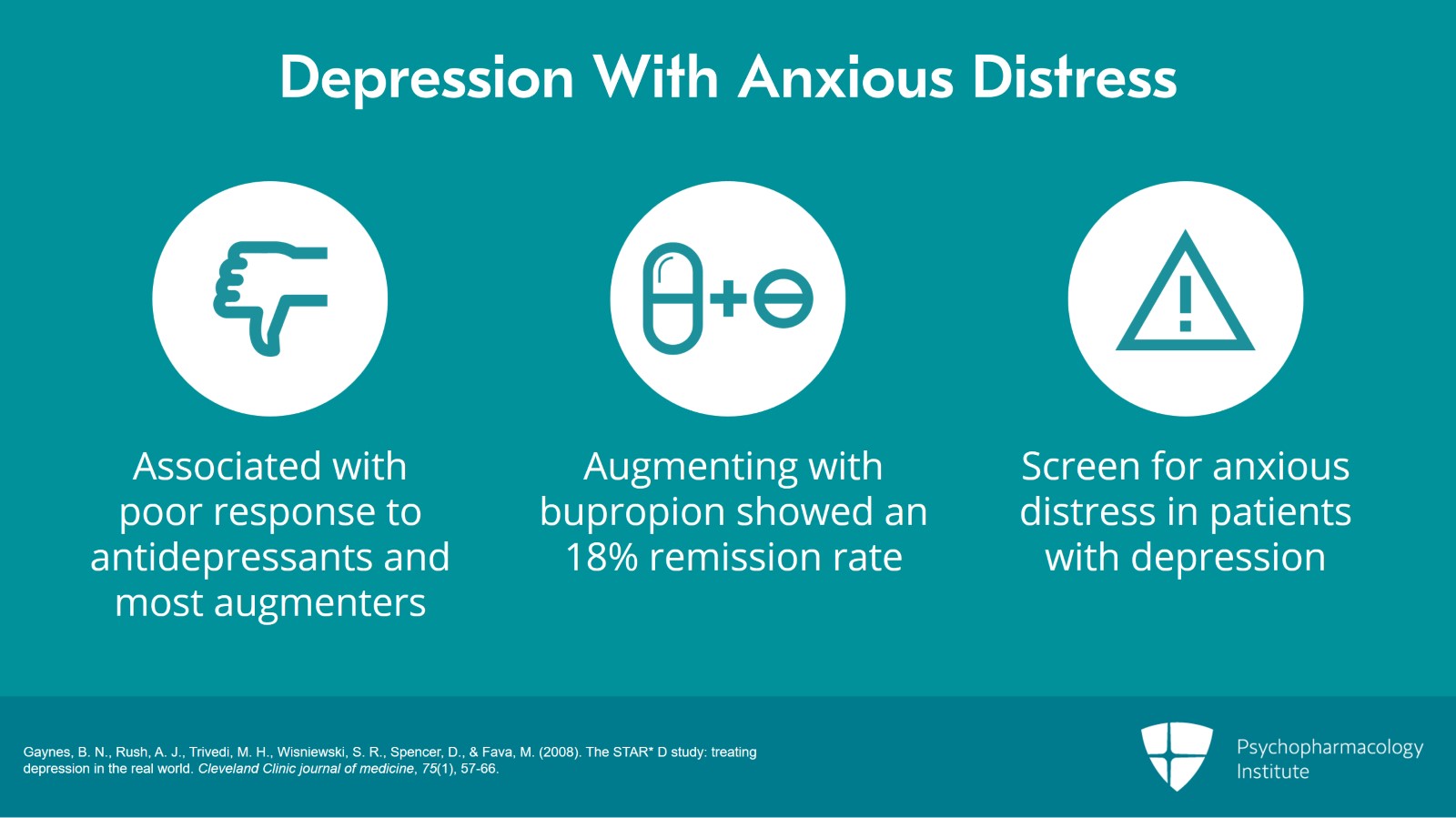 But the key thing about depression with anxious distress is it’s my impression clinicians do not think of this. They’re not aware of this evidence on how it changes treatment when there’s a lot of anxiety associated with your patient with major depression. They don’t identify the specifier. They try to treat the depression in the usual manner and this is not often rewarding.