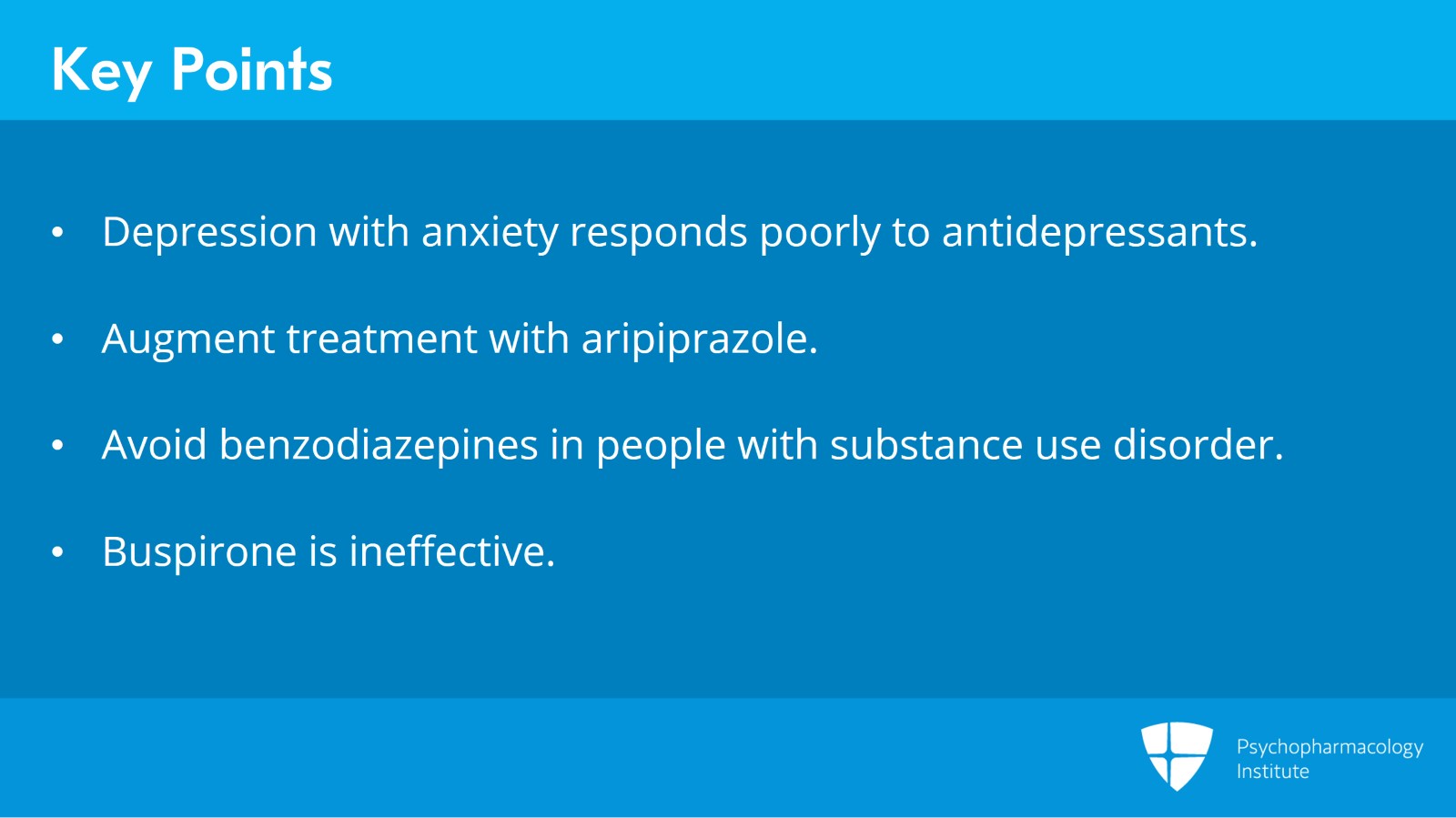And the final key point, major depression with a lot of anxiety responds poorly to almost all antidepressants and their augmenters except it seems for the atypical antipsychotics as augmenters. And of those, we prefer aripiprazole. Benzodiazepines may help and are to be avoided though in people with substance abuse. But buspirone seems ineffective.