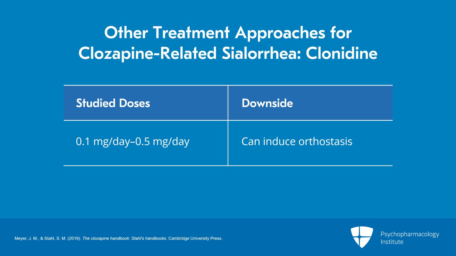 Other treatment approaches based on case reports or case series include the alpha-2 agonist, clonidine. Alpha-2 neurotransmission is actually involved in the salivary reflex and if you stimulate it with clonidine you actually lower salivary output. The doses of clonidine studied have been between 0.1 and 0.5 mg per day. The big downside of clonidine is that it itself can induce orthostasis and this may be a problem in somebody who’s already perhaps experiencing orthostasis from clozapine. Clonidine is not very commonly used but it does exist and there is some supportive data for this purpose.