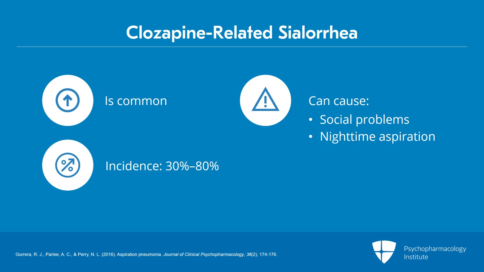 Well, there are some issues with clozapine-related sialorrhea which are really important. For one thing, it’s common. The incidence rate is 30% to 80%, not always dose dependent. Not only does this cause a social problem especially if people drool during the daytime but the bigger concern is nighttime aspiration which may increase the risk for pneumonia.