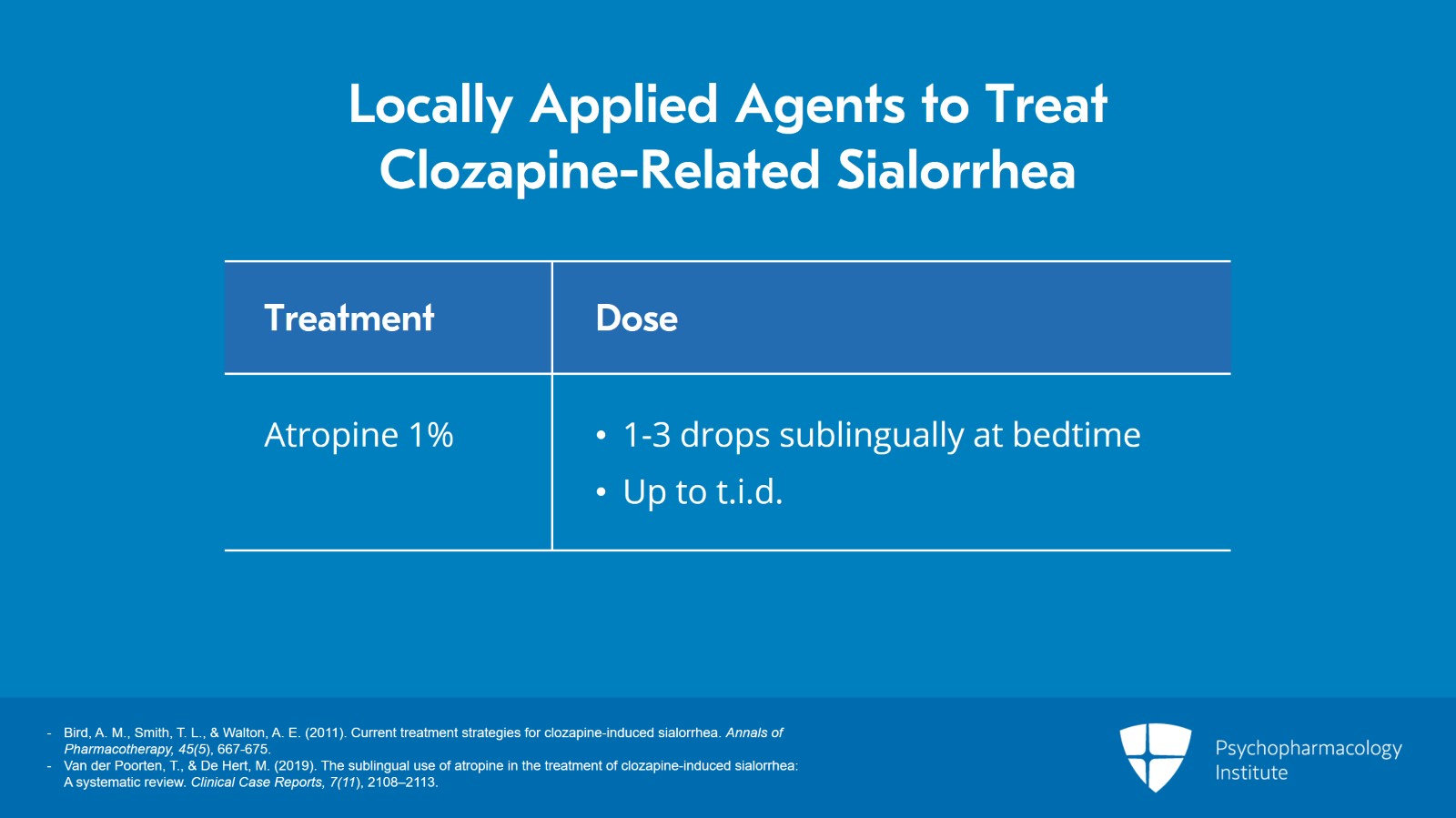 • Van der Poorten, T., & De Hert, M. (2019). The sublingual use of atropine in the treatment of clozapine-induced sialorrhea: A systematic review. Clinical Case Reports, 7(11), 2108–2113.