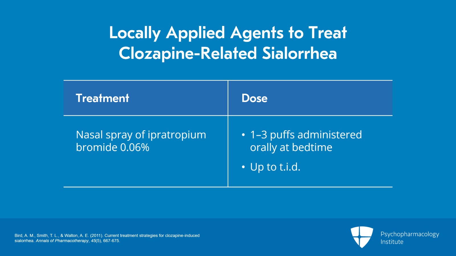 • Bird, A. M., Smith, T. L., & Walton, A. E. (2011). Current treatment strategies for clozapine-induced sialorrhea. Annals of Pharmacotherapy, 45(5), 667-675.
