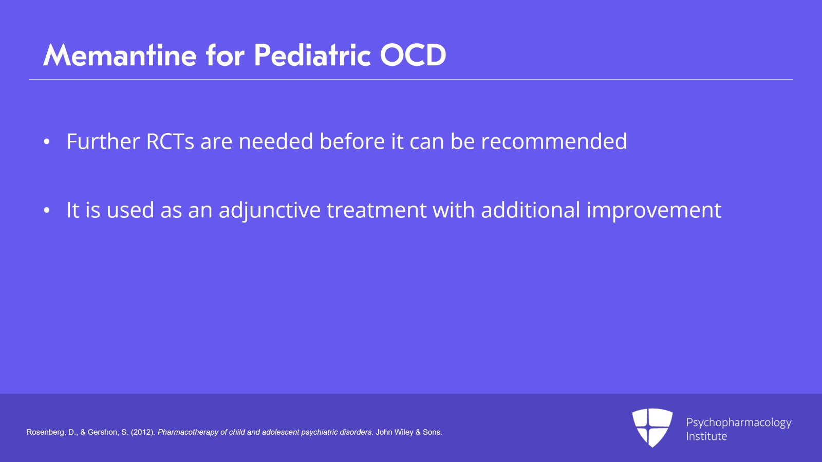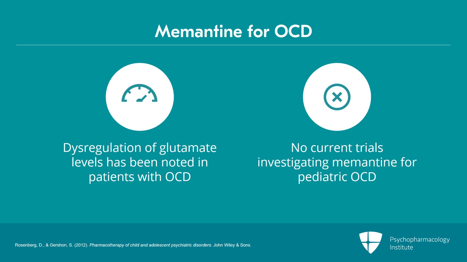This is another exciting area where this is being used fairly routinely in OCD clinics across the country. Dysregulation of glutamate levels have been noted in the brains of patients with OCD but there currently are no trials investigating memantine in pediatric OCD.