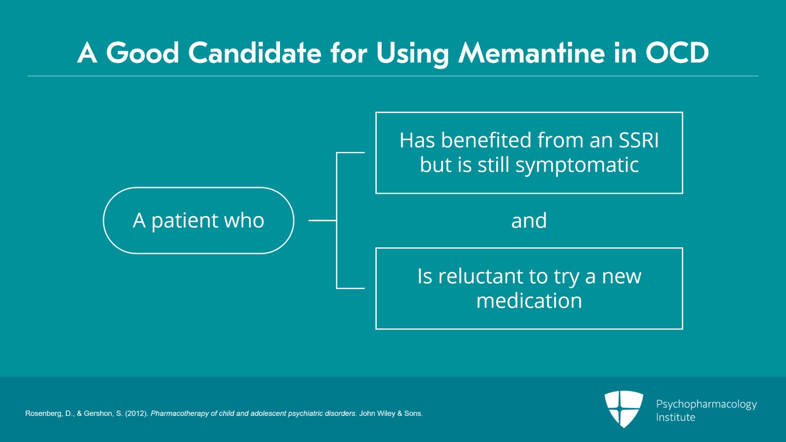 A good example would be a patient who has achieved some benefit from their SSRI but not enough and are still symptomatic but the parent or patients, they are reluctant to try a new SSRI or medicine to attempt to get full remission of symptoms in part because they don’t want to give up the gains they’ve made. They realize it’s not enough but they want more. And in those cases, given the safety and potential for some augmentation benefit, we will add memantine.