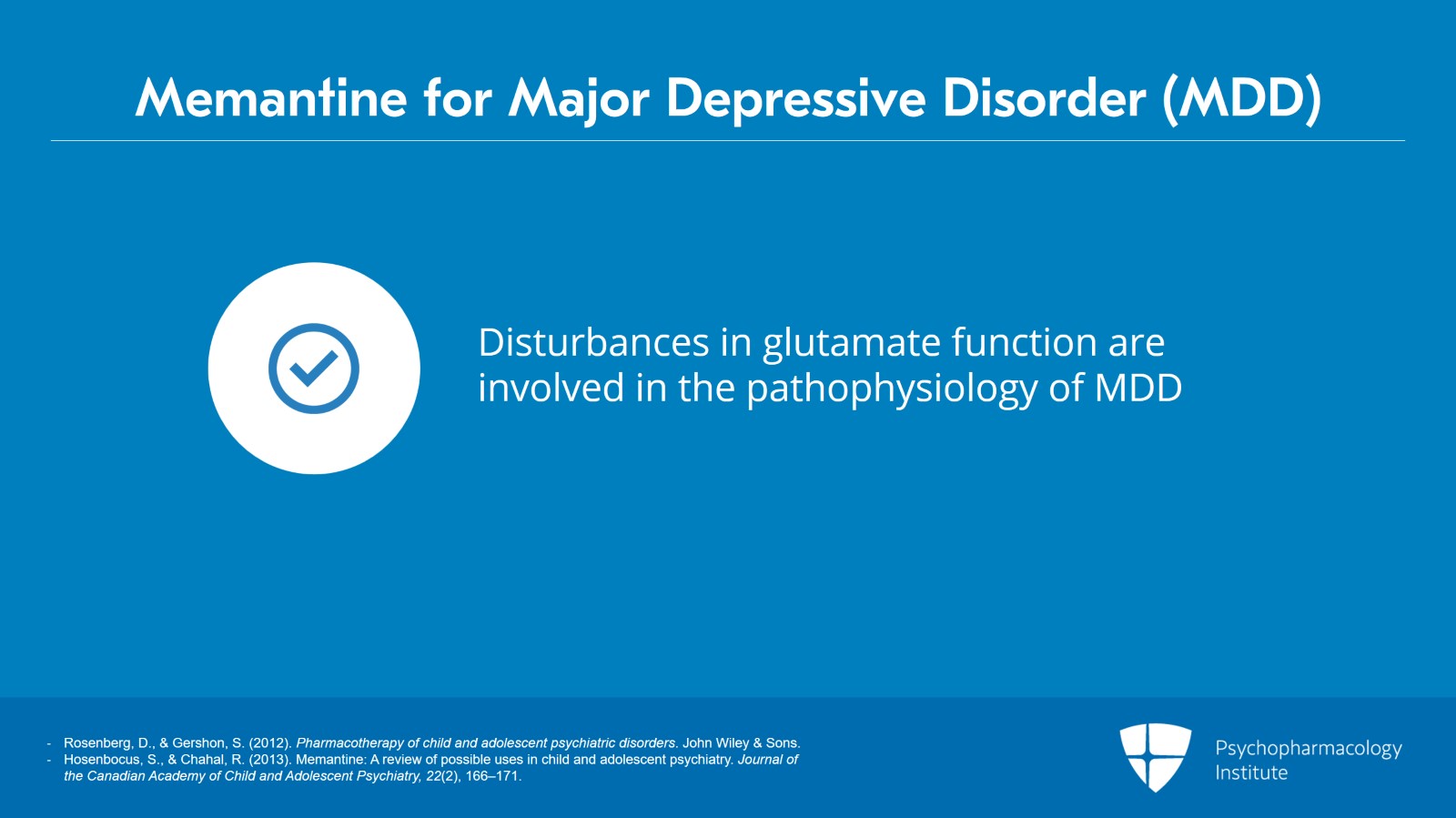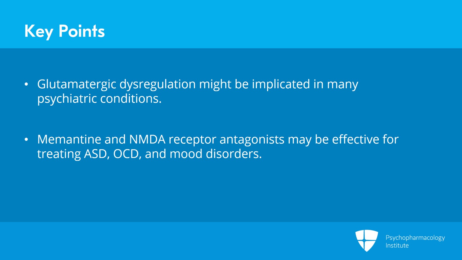 The key take-home points here are that glutamatergic dysregulation has been investigated in multiple studies with the role of the glutamatergic system implicated in many psychiatric conditions and that there are indications that memantine and NMDA receptor antagonists may have a beneficial effect for the treatment of autism, OCD, and mood disorders.