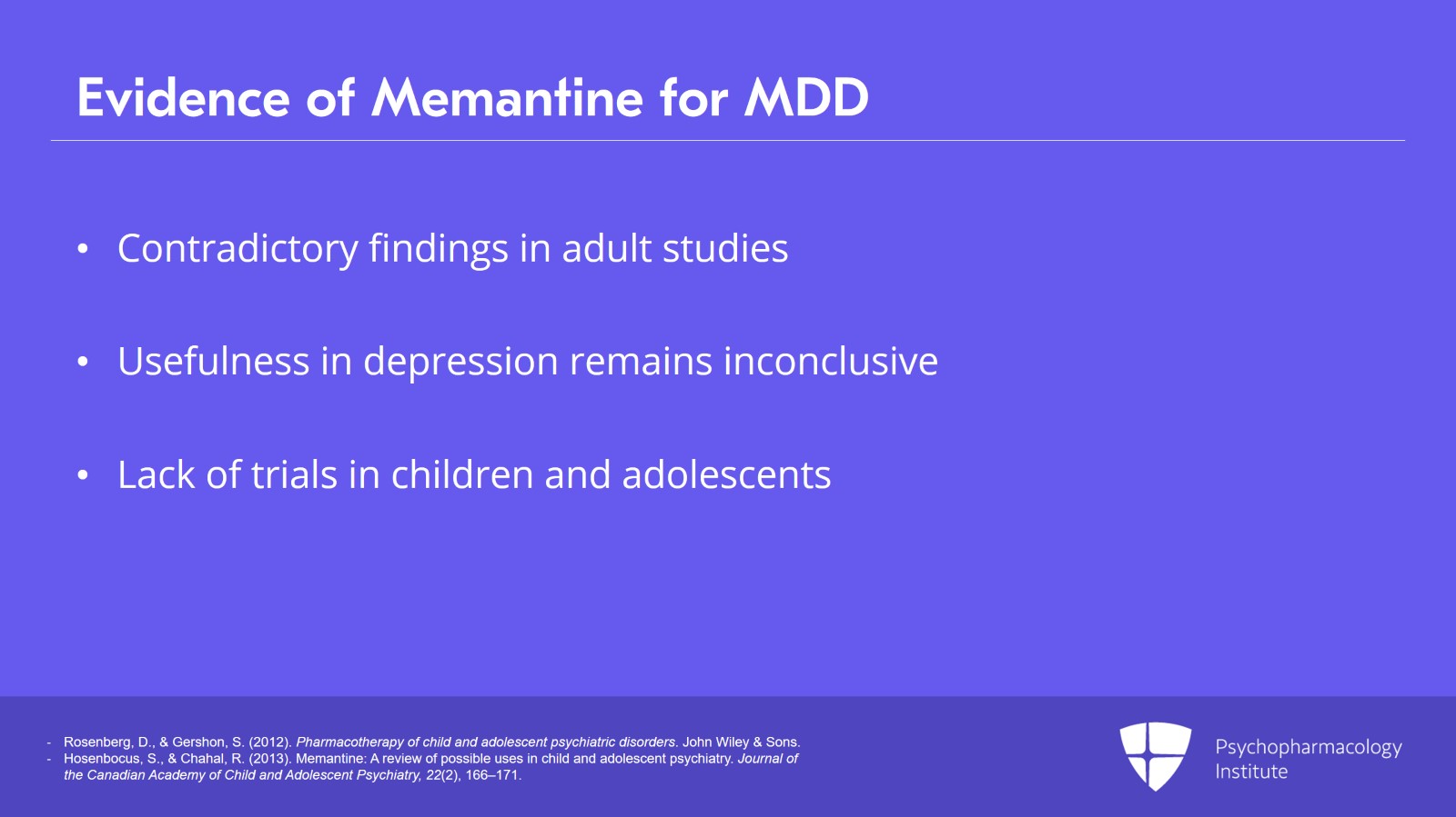 And results from two randomized controlled studies and open-label study and several case reports on the use of memantine for depression therapy for adults had produced contradictory findings. Neither of the studies which observed positive effects from memantine treatment included a control group.