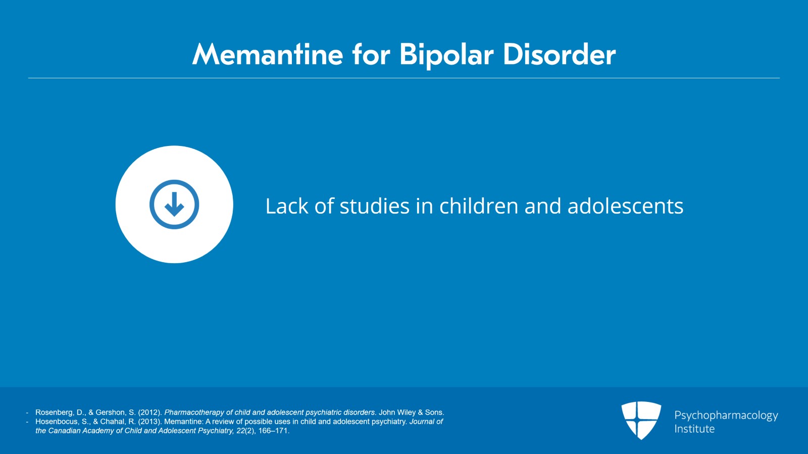 So while memantine has demonstrated positive effect as an augmentation therapy for adults with bipolar disorder, there are no studies in children or adolescents with bipolar disorder.