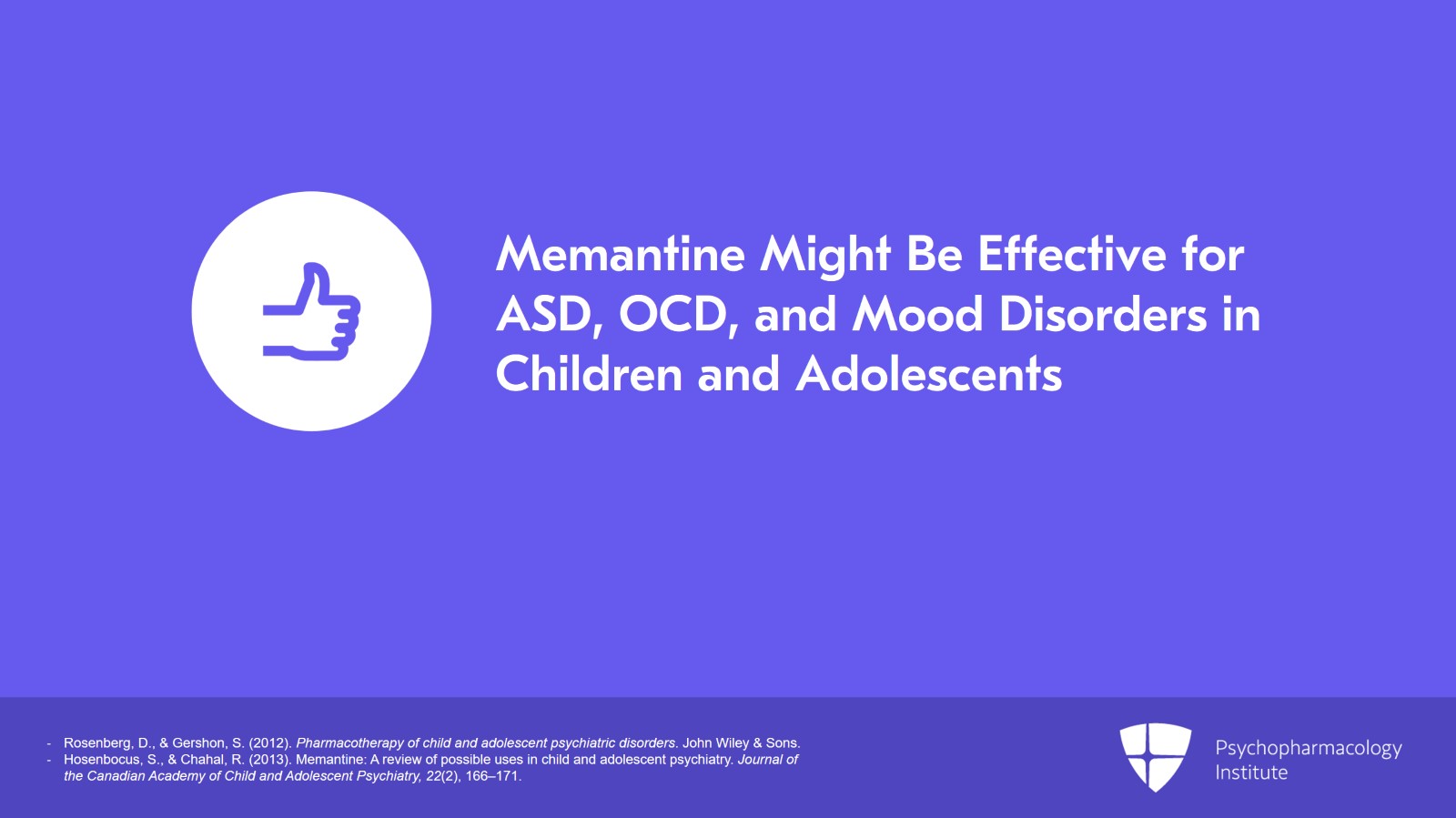 In conclusion, based on the available research, there are indications that memantine may have a key signal and beneficial effect for the treatment of autism, OCD, and mood disorders particularly bipolar disorder in children and adolescents.