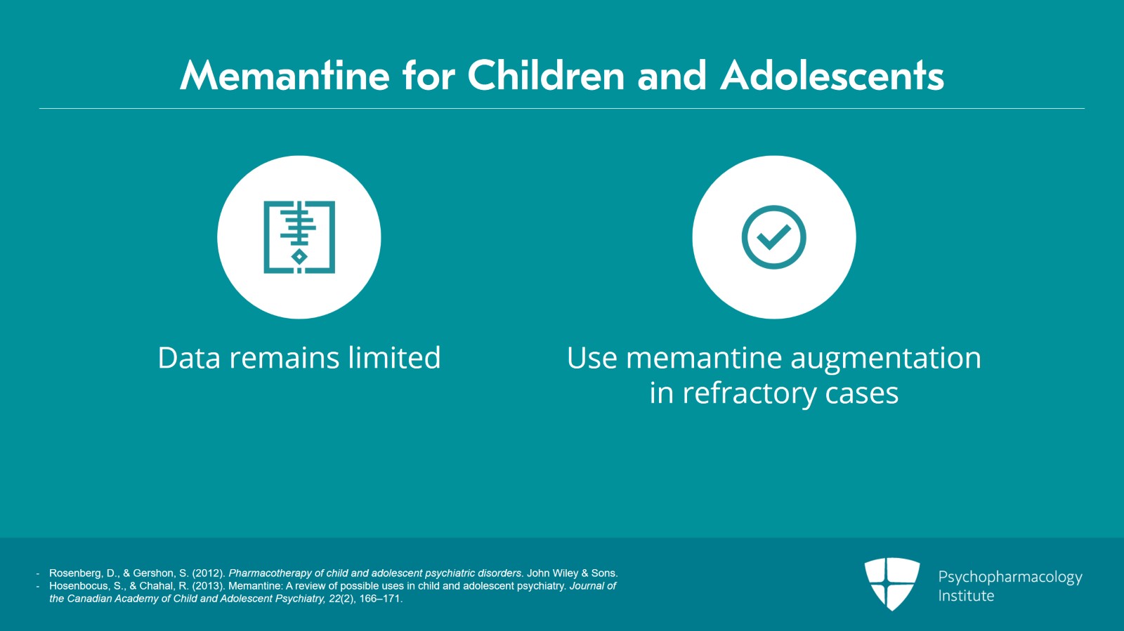 - Hosenbocus, S., & Chahal, R. (2013). Memantine: A review of possible uses in child and adolescent psychiatry. Journal of the Canadian Academy of Child and Adolescent Psychiatry, 22(2), 166–171.