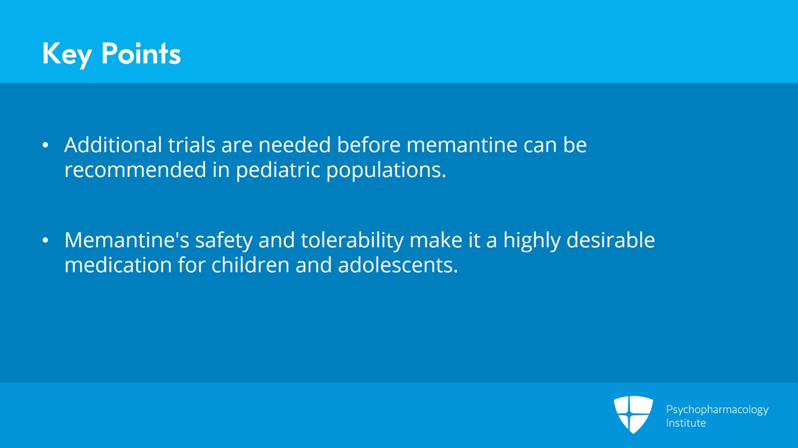 If efficacy is demonstrated, memantine’s excellent safety record and tolerability make it a highly desirable medication for use in children and adolescents.