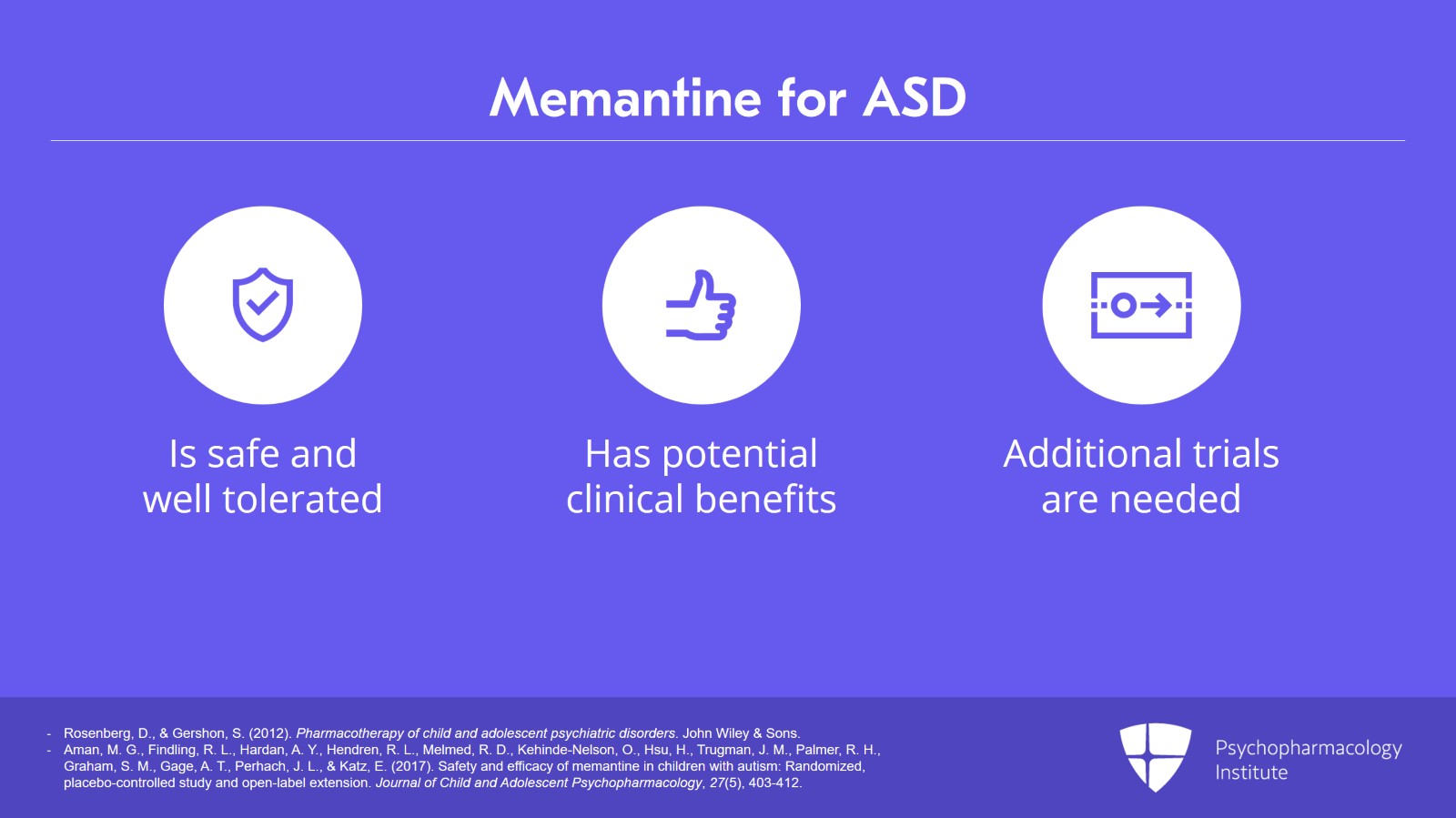 - Aman, M. G., Findling, R. L., Hardan, A. Y., Hendren, R. L., Melmed, R. D., Kehinde-Nelson, O., Hsu, H., Trugman, J. M., Palmer, R. H., Graham, S. M., Gage, A. T., Perhach, J. L., & Katz, E. (2017). Safety and efficacy of memantine in children with autism: Randomized, placebo-controlled study and open-label extension. Journal of Child and Adolescent Psychopharmacology, 27(5), 403-412.