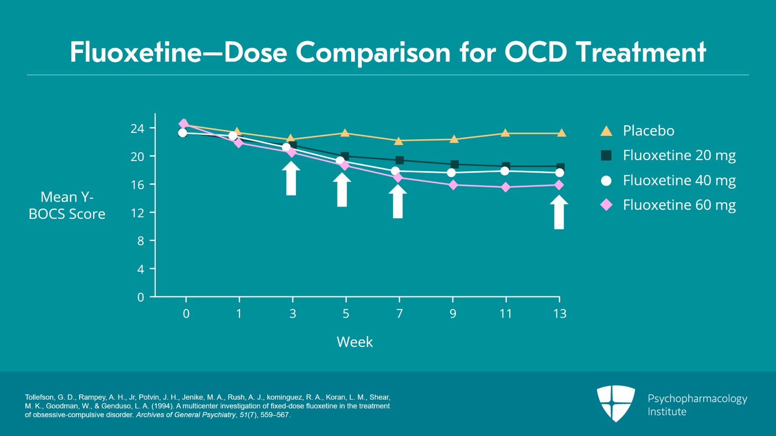 This is the comparison over 13 weeks of three doses of fluoxetine versus placebo. And if you can see the graph, you would notice that over the first three weeks there's absolutely no difference from placebo. But at five weeks, we start to see a separation of the three doses. All three are better than the placebo by several Y-BOCS points at week 5 but the three – the high, low, and medium dose – are all exactly the same. It's only when you get to week 7 that there's a little bit of pulling ahead of the Y-BOCS improvement from the 40 and 60 mg fluoxetine versus the 20. And then between week 7 and 13, things stayed pretty much the same. The three doses are all actually improving versus the placebo to an equal degree but the difference between the three doses is still only 2 points, maybe 2.5 points on the Y-BOCS which is that 7% to 9% I was talking about.