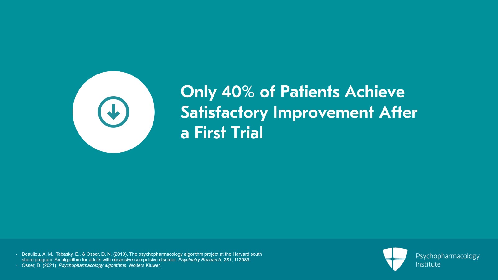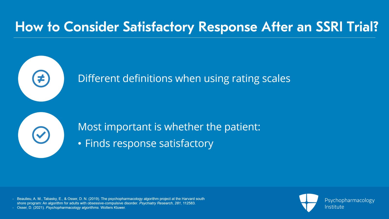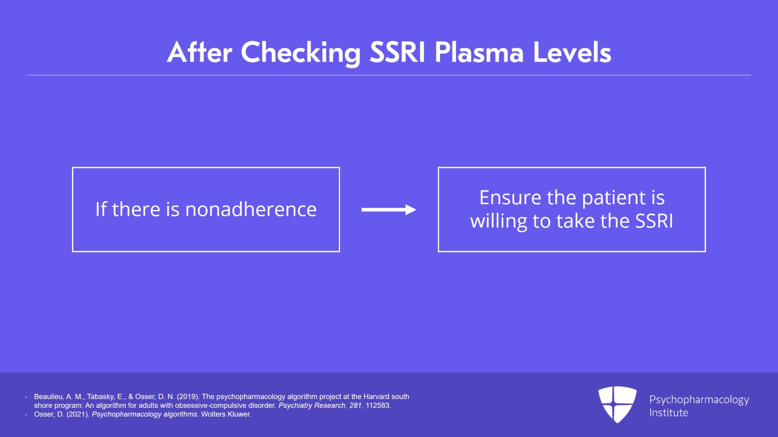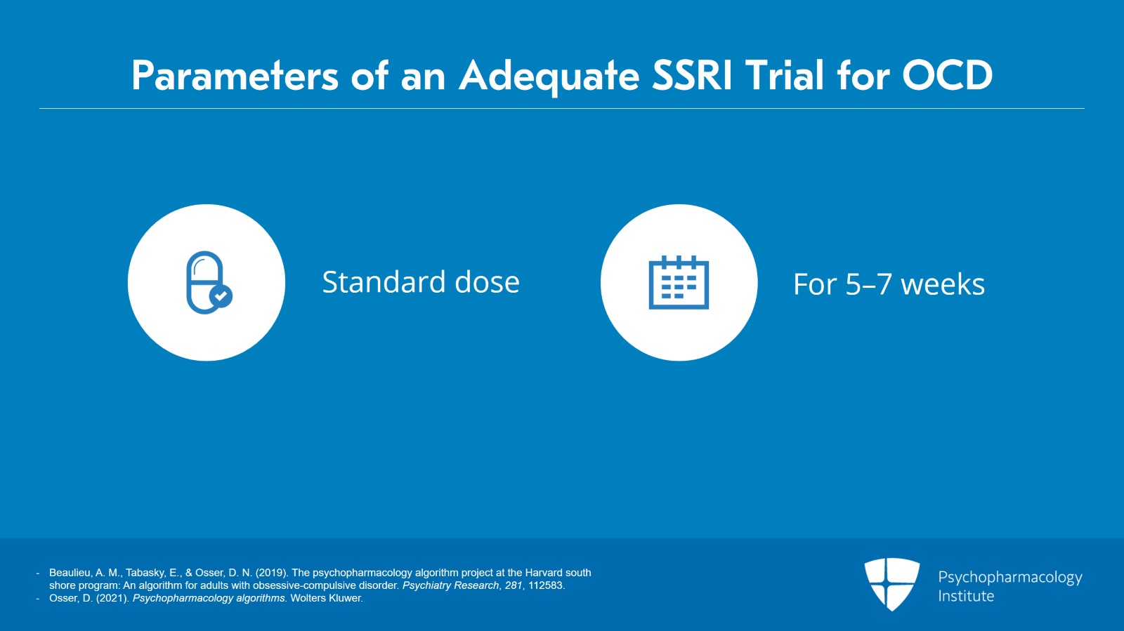 - Beaulieu, A. M., Tabasky, E., & Osser, D. N. (2019). The psychopharmacology algorithm project at the Harvard south shore program: An algorithm for adults with obsessive-compulsive disorder. Psychiatry Research, 281, 112583.