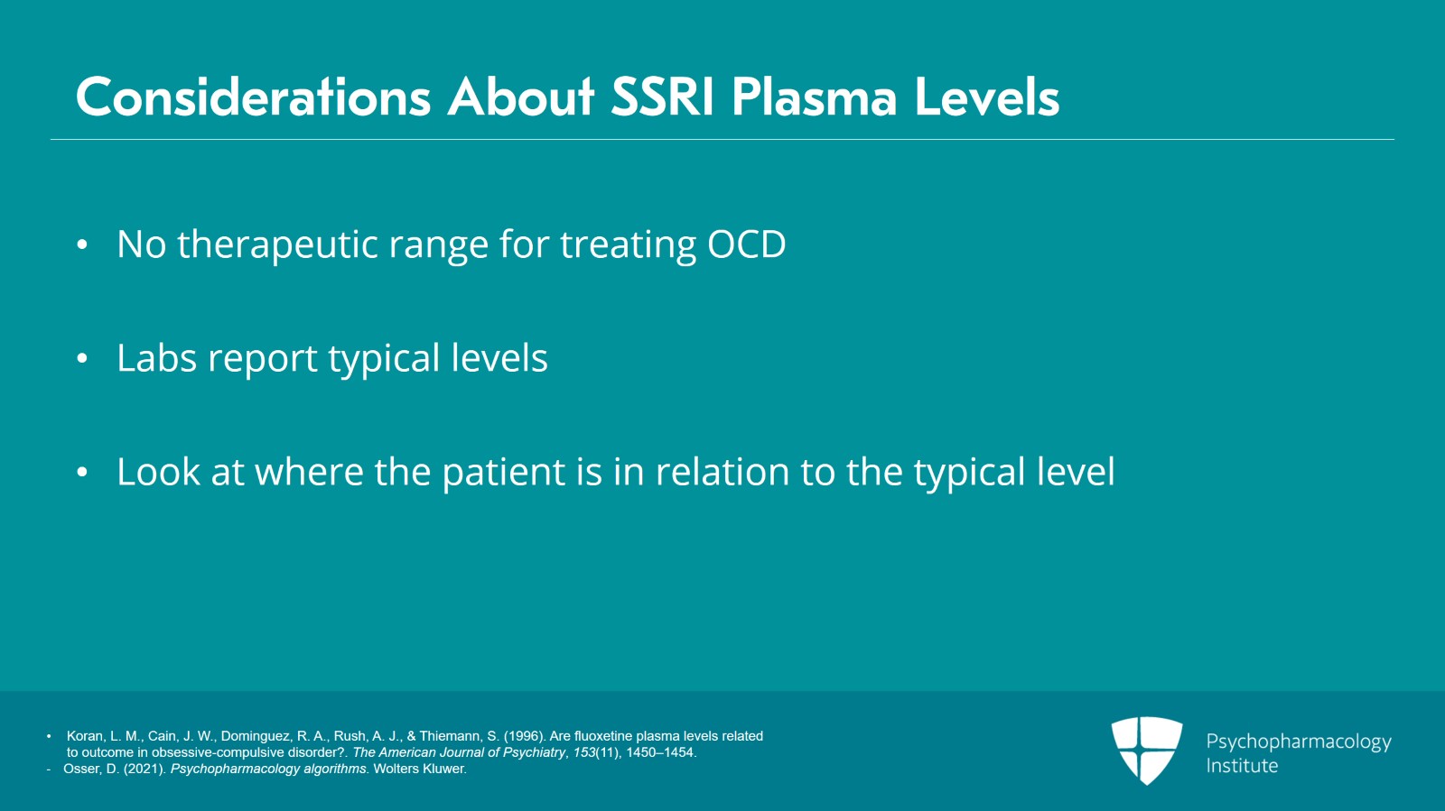 - Koran, L. M., Cain, J. W., Dominguez, R. A., Rush, A. J., & Thiemann, S. (1996). Are fluoxetine plasma levels related to outcome in obsessive-compulsive disorder?. The American Journal of Psychiatry, 153(11), 1450–1454.